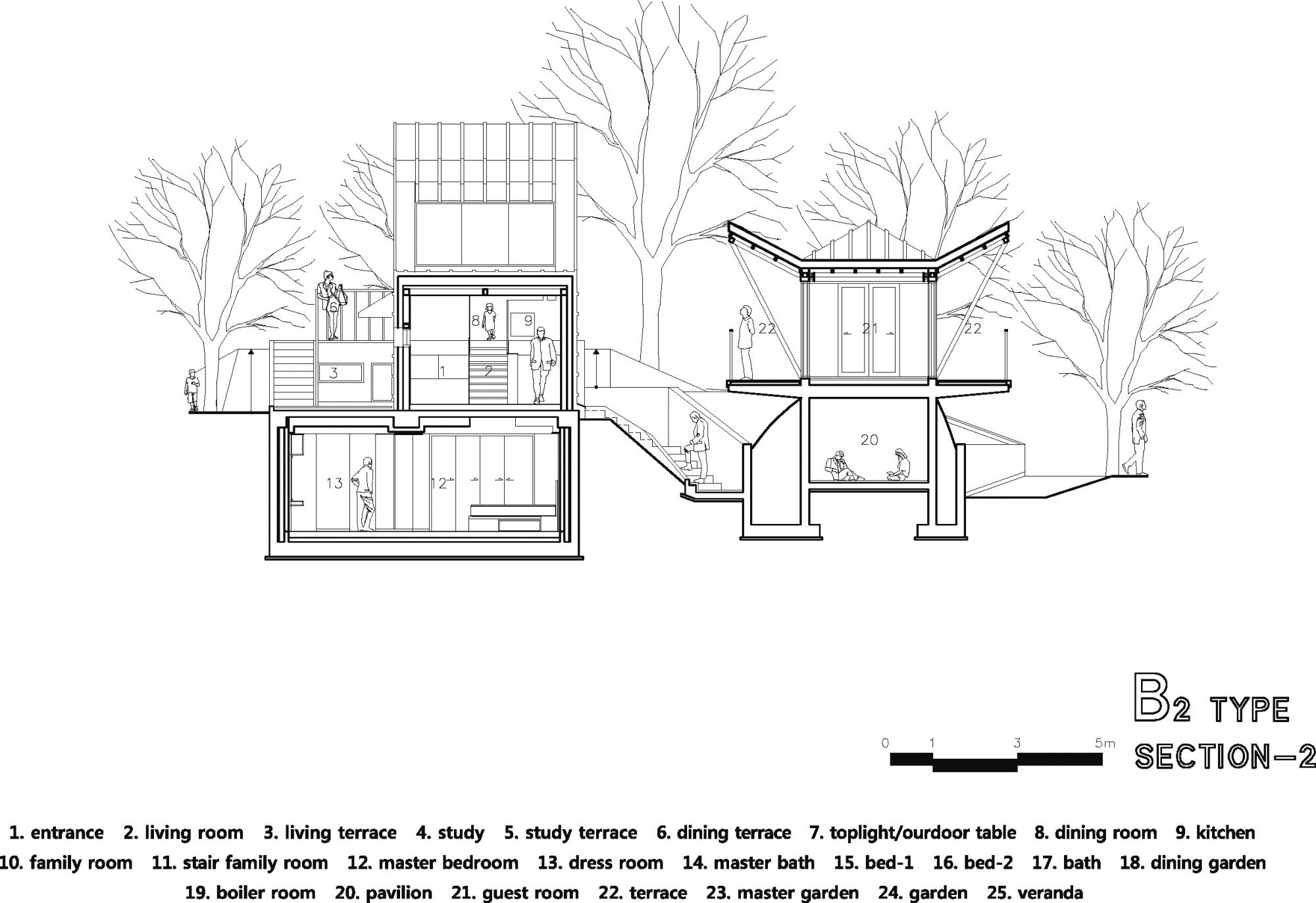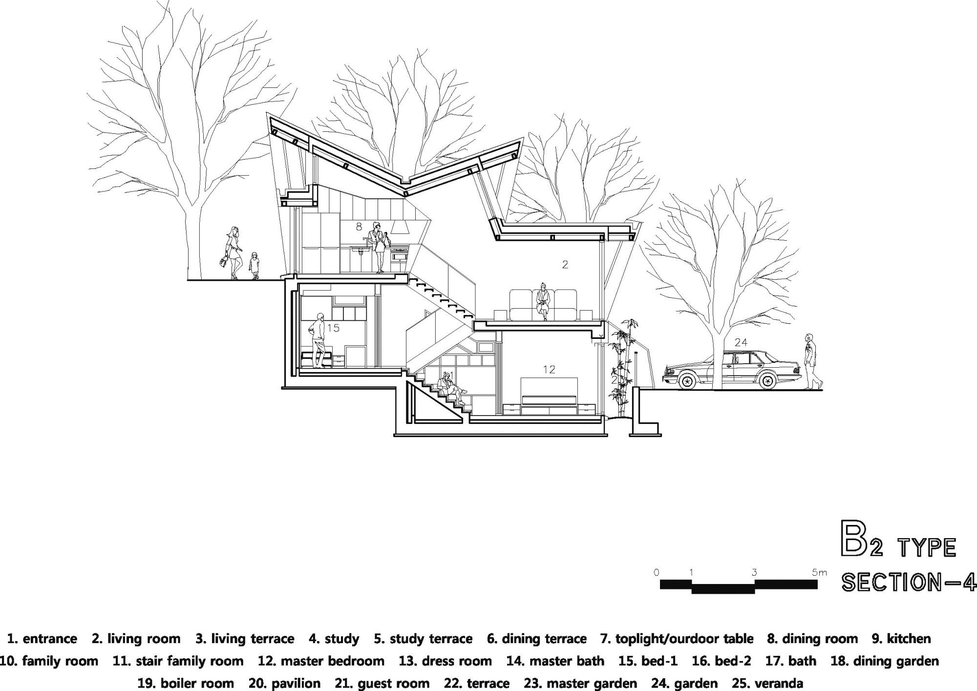 By skipfloor scheme(split level scheme) which has been applied to sloped hillside, interior spaces are small area but having interesting experience of space.