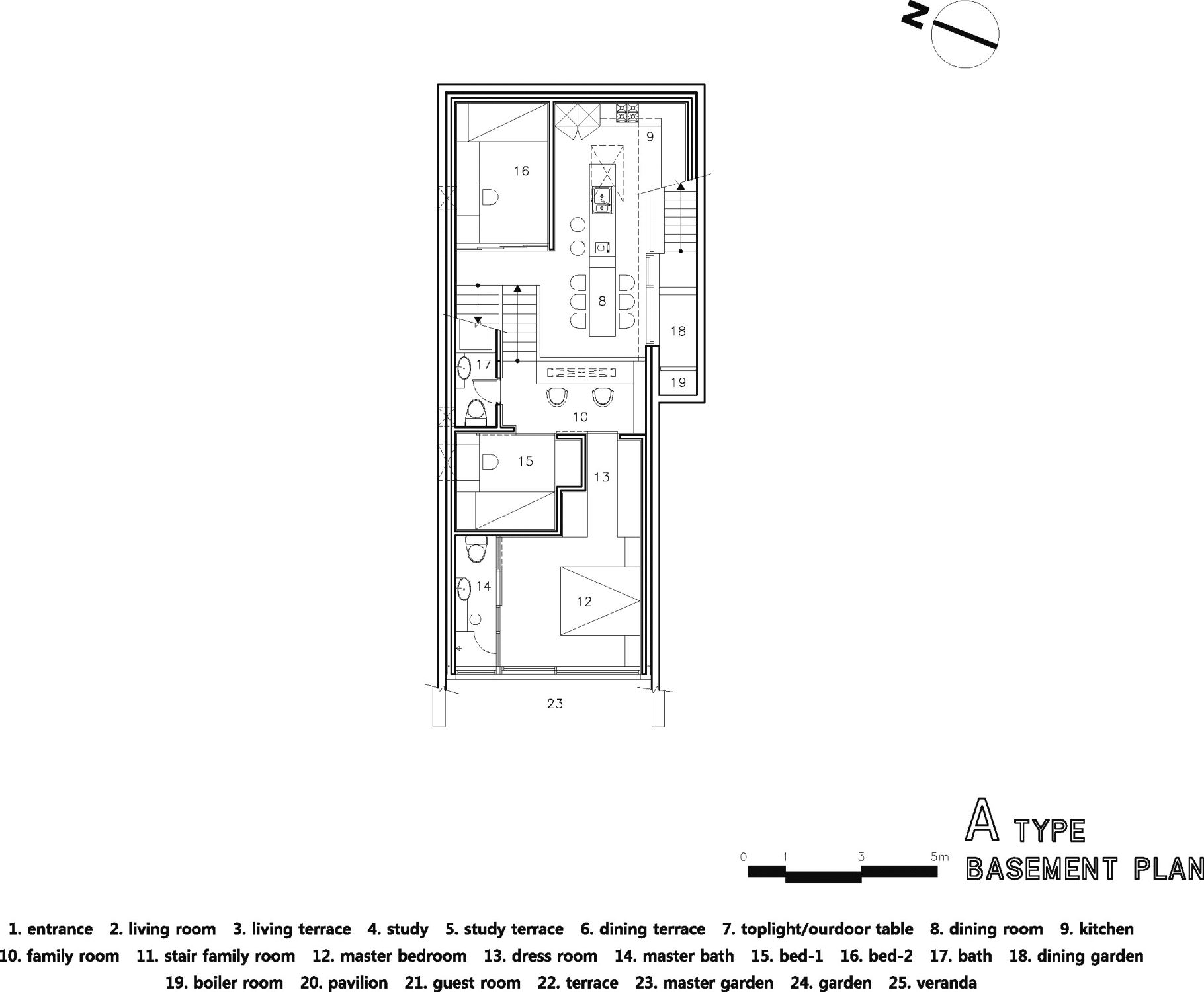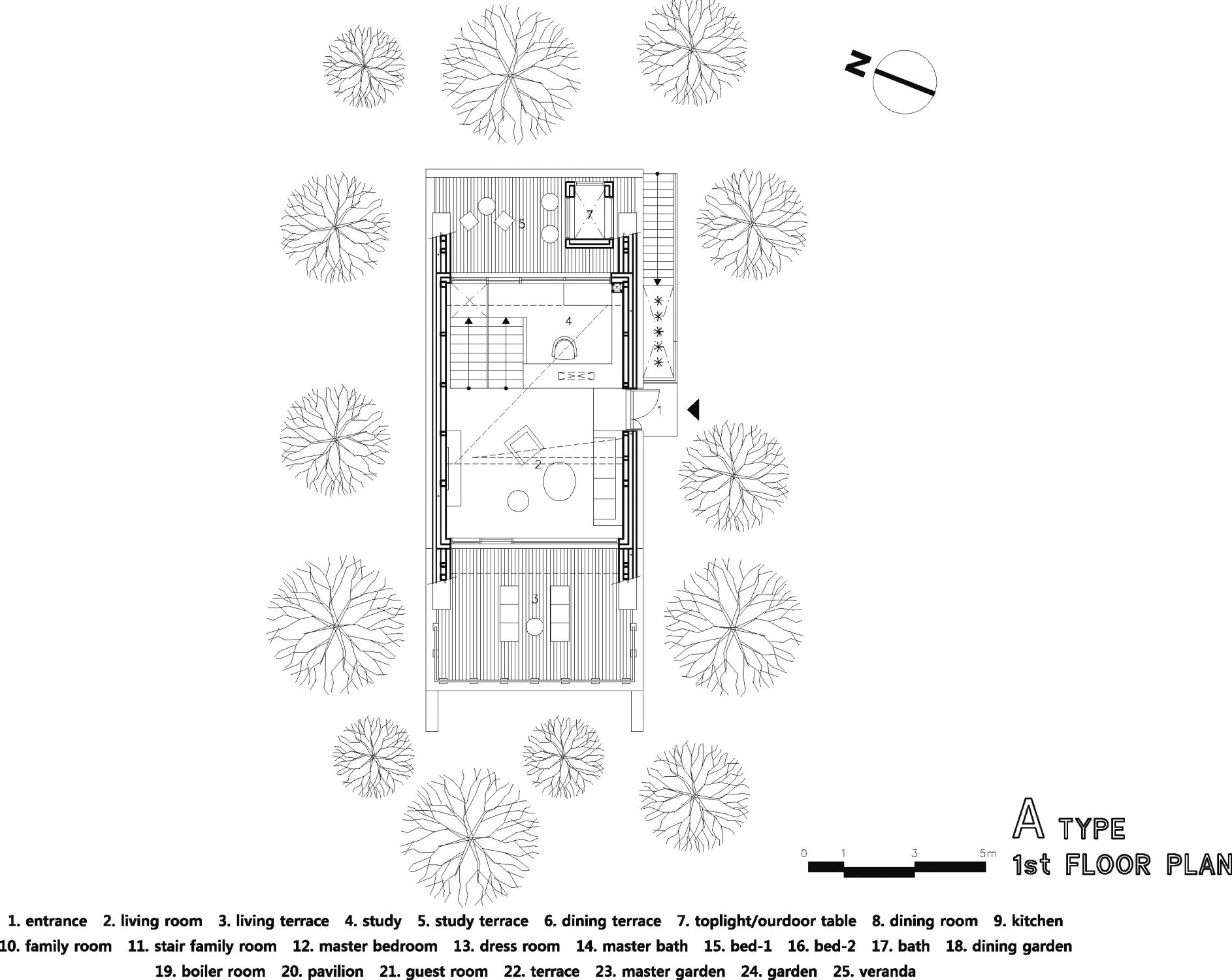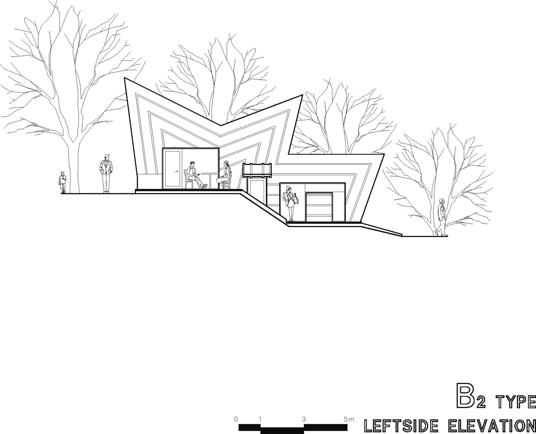 To introduce sufficient sunlight and surrounding view into the interior spaces in each levels, we designed clear story(roof-level window) framed in angled roofs and to protect privacy from the neighbor’s sight, slant walls are attached on main masses.