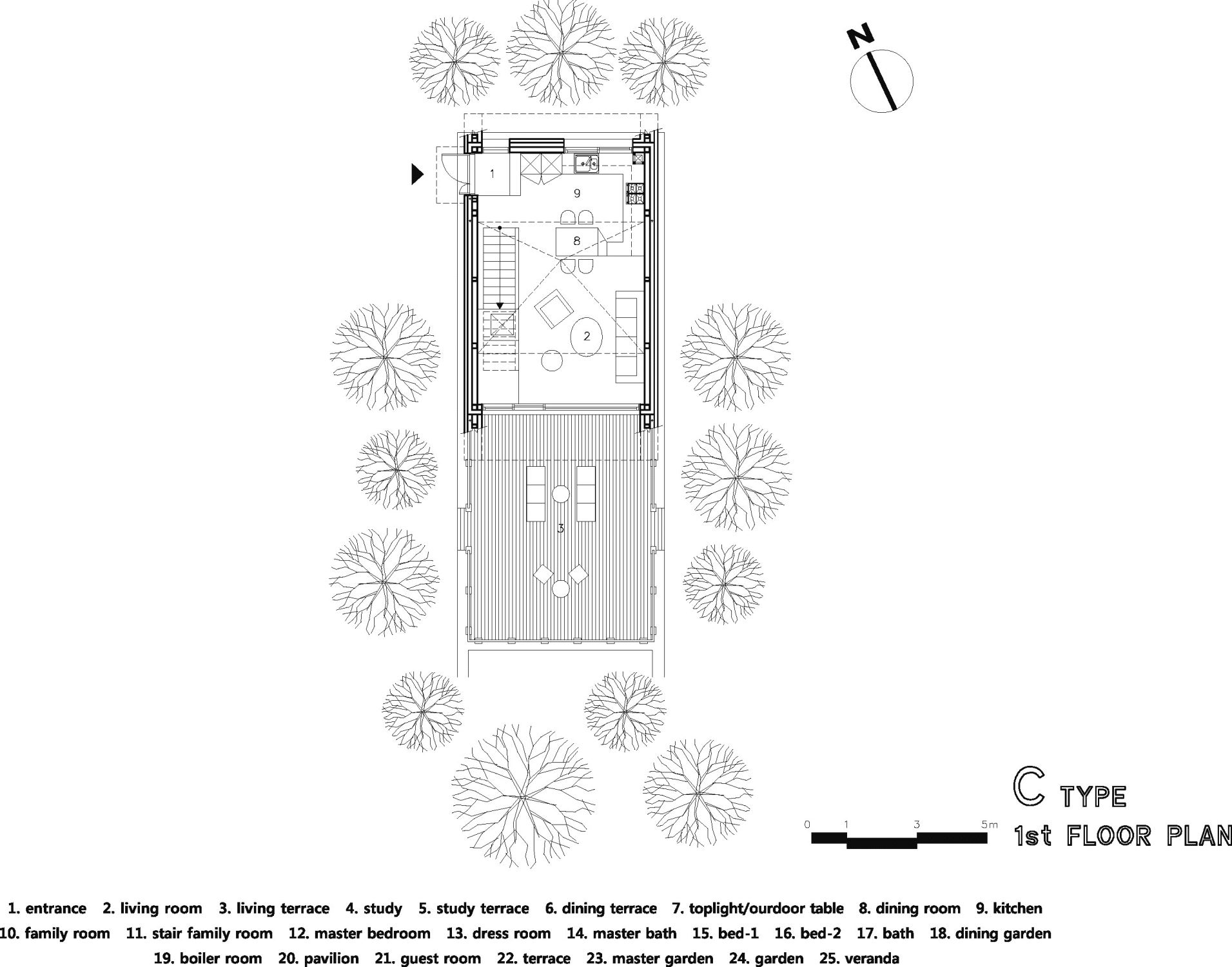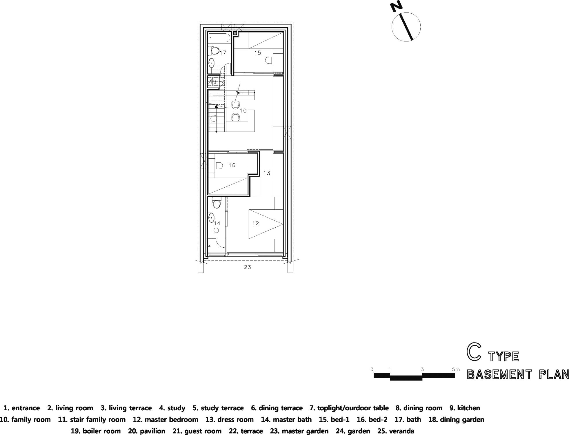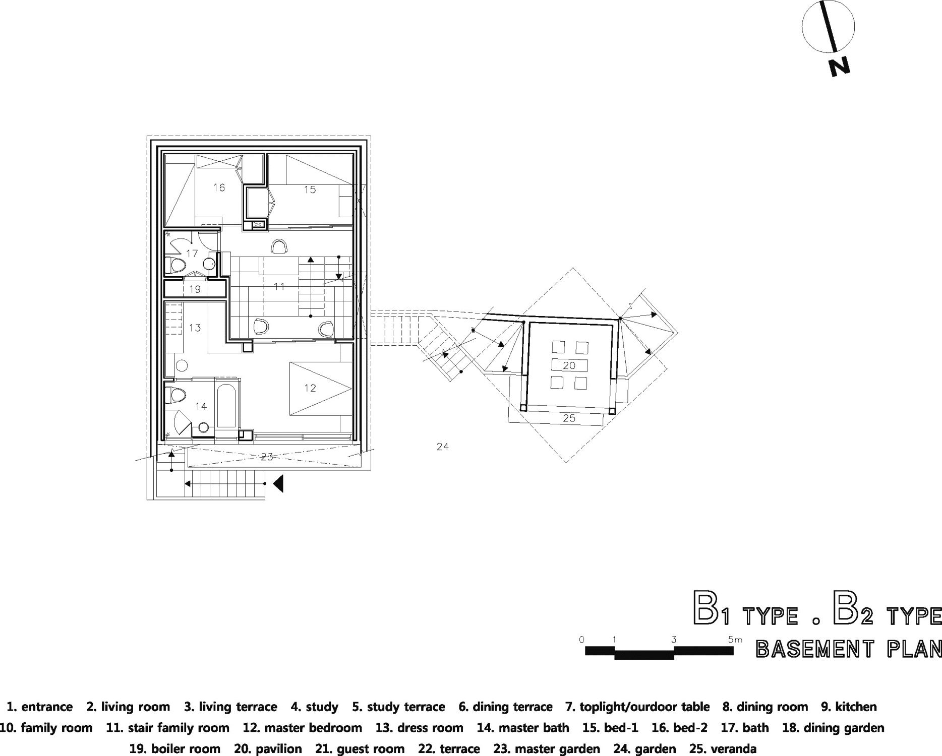 To introduce sufficient sunlight and surrounding view into the interior spaces in each levels, we designed clear story(roof-level window) framed in angled roofs and to protect privacy from the neighbor’s sight, slant walls are attached on main masses.