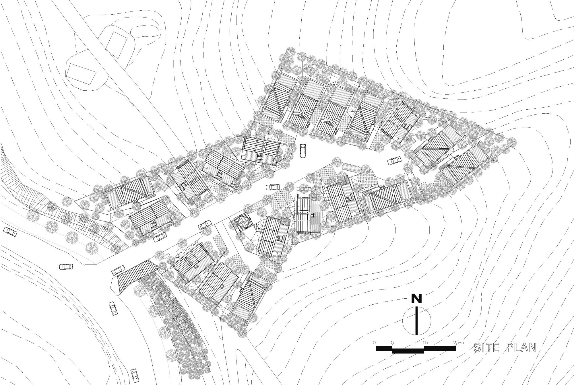 Zigzag spaces of skip floor scheme(split level scheme) of houses laid along the hillside shape inclined line on the skins of houses.