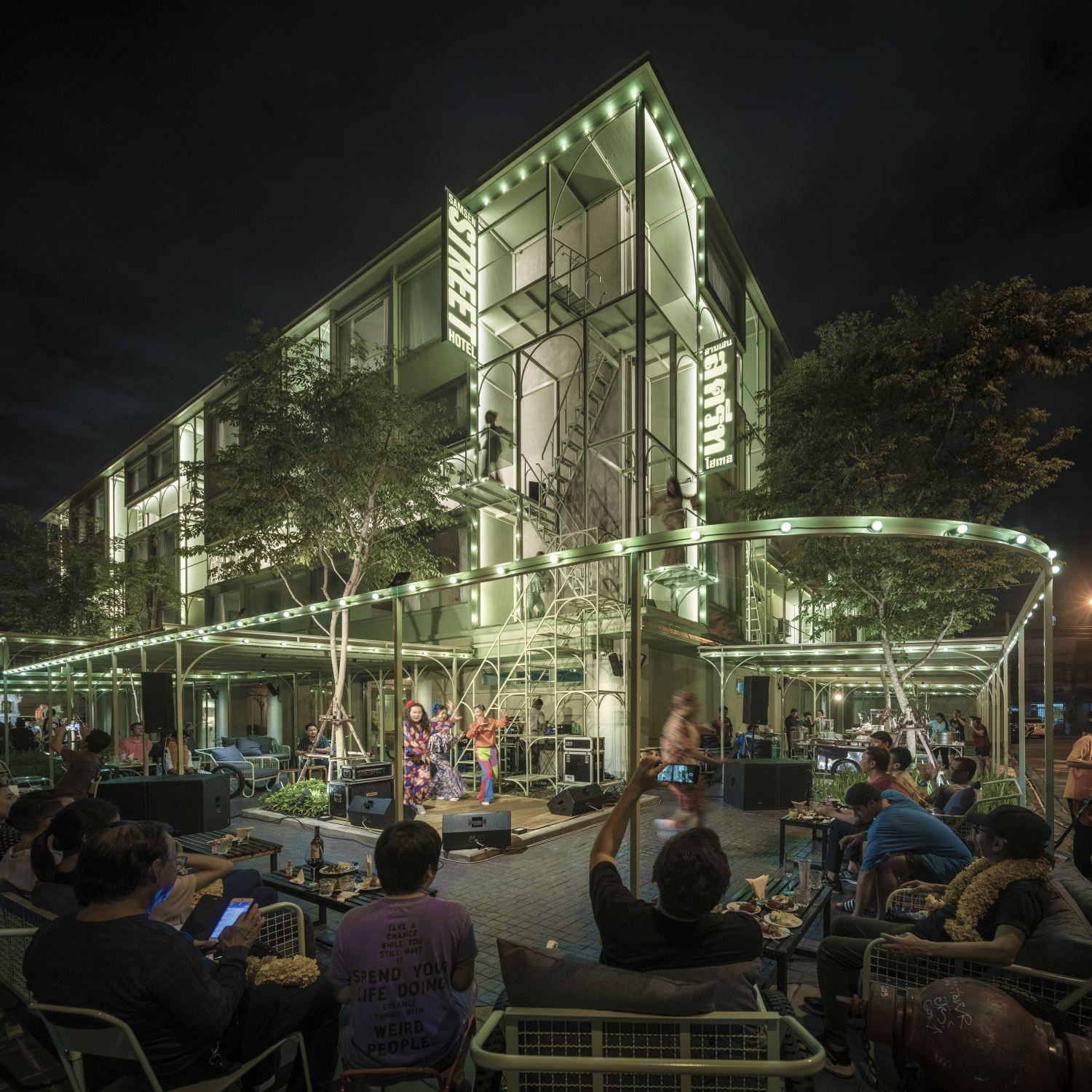 Samsen STREET Hotel at night—the green “soi” scaffolding transforms into a vertical stage on weekends and holidays, allowing for public street concerts to re-energize this once dilapidated red-light neighborhood
