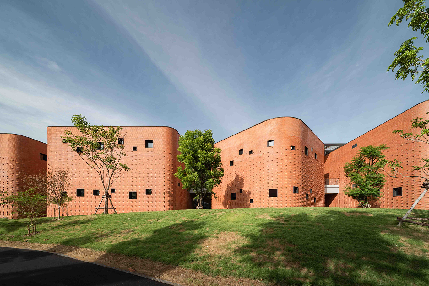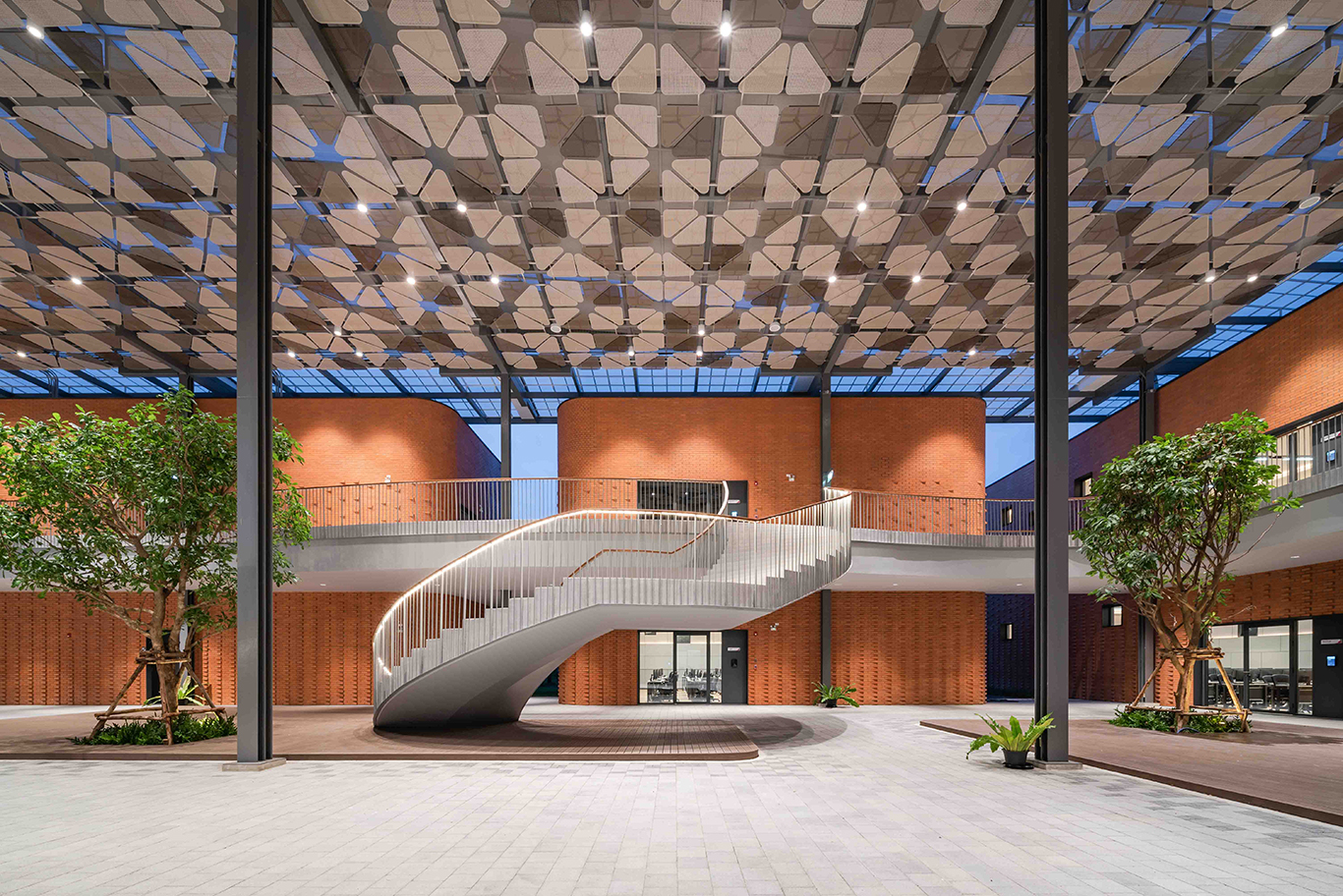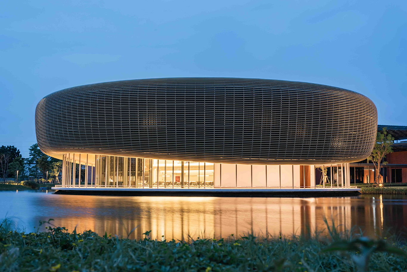 An oval-shaped auditorium, reflects and promotes the idea of a happy community, and the overall atmosphere creates a collaborative working culture. Facilities include a 1,000-seat auditorium, training rooms that can accommodate 20 to 200 people, and 73 guestrooms. Residential units are secluded from the street, with views of the lake, offering privacy and a place for relaxation.