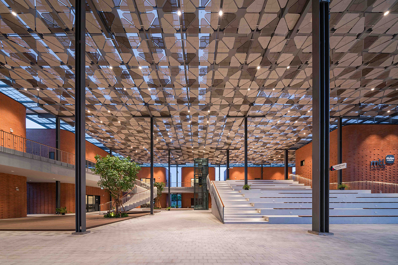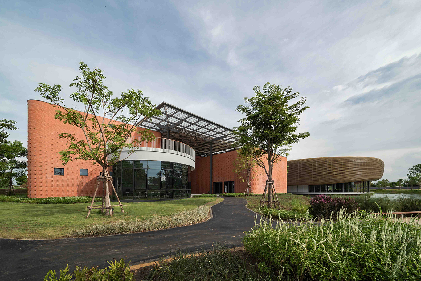 Muang Thai Life Assurance, PCL., also places great importance on energy efficiency and environmental protection. Thus, the Academy Center in Ratchaburi was registered for the US Green Building Council’s standard Leadership in Energy and Environmental Design (LEED), and achieved Gold level certification in October 2020. Architectural and engineering design results in a 26% reduction in energy consumption in comparison to other facilities of similar size and function. This was achieved, in part, by employing renewable energy systems, such as roof-top solar panels. Daylight analysis and computational simulation were used to determine the best design and location for the skylight in the learning area to create a naturally lit space which reduces energy consumption during the day. This learning area is also naturally ventilated, minimizing the need for air conditioning. The landscape architecture, with its green areas and large ponds, is designed to reduce the heat as well as the Mean Radiant Temperature (MRT) surrounding the project.