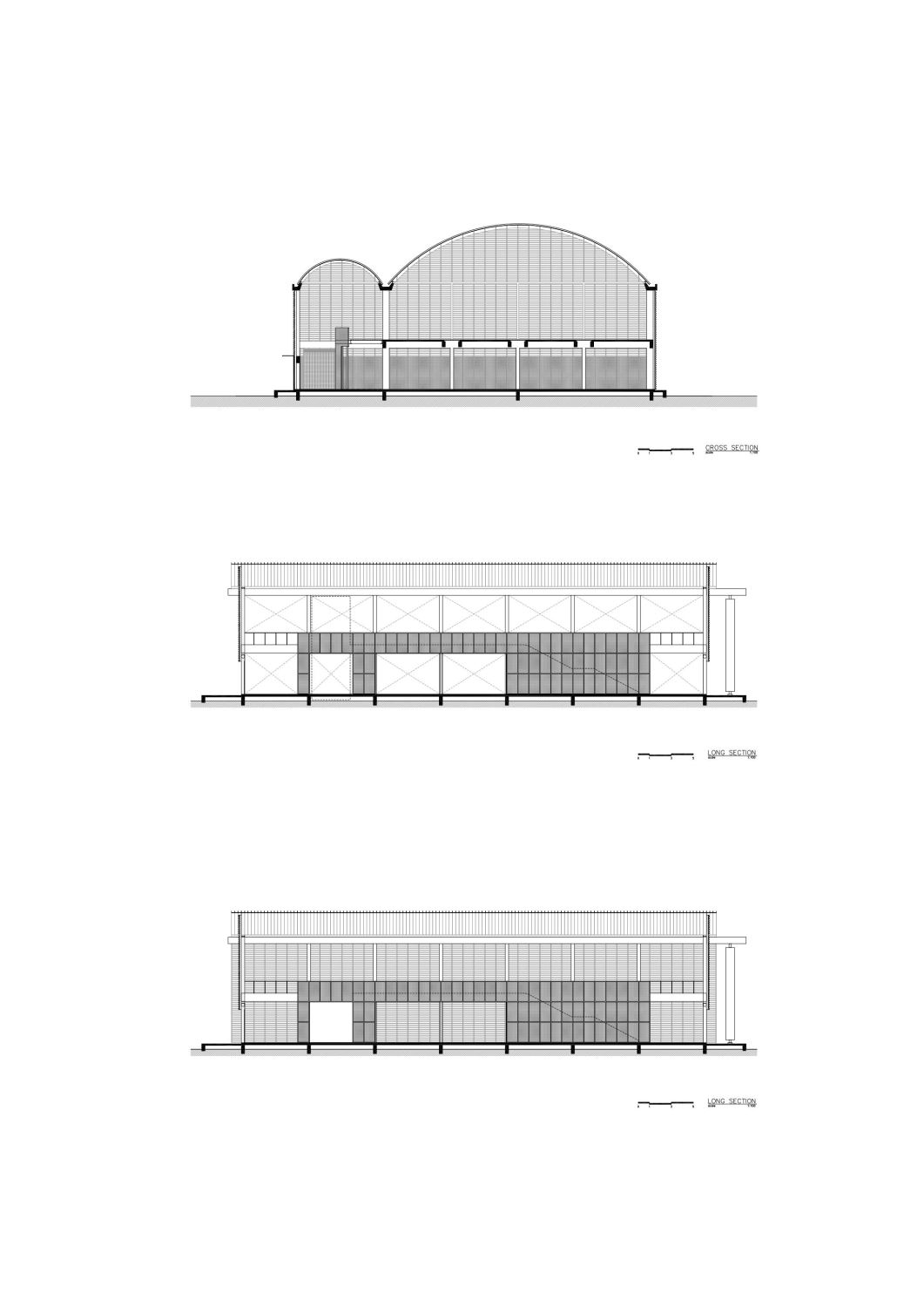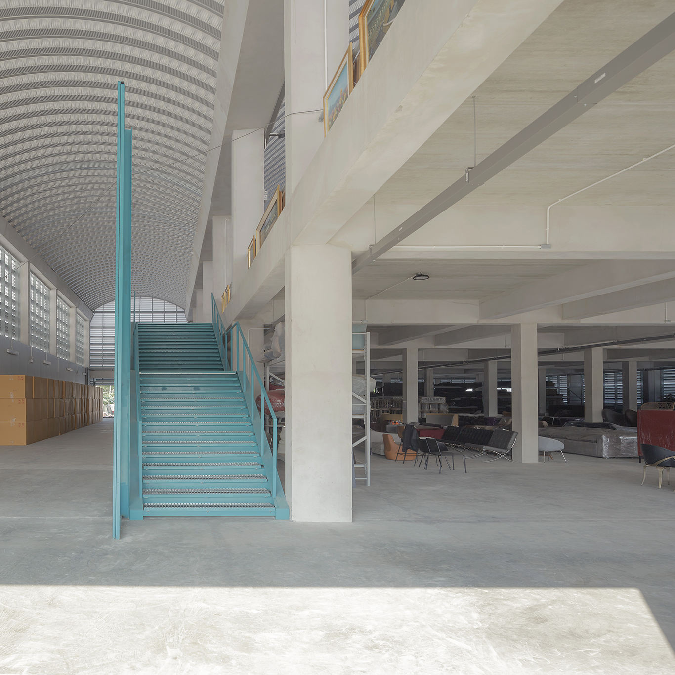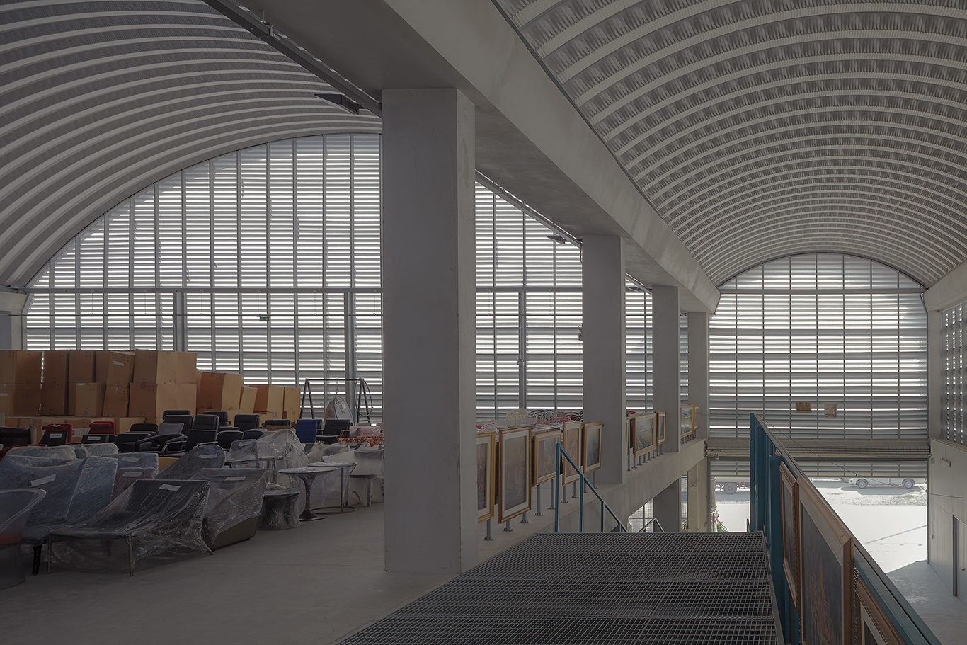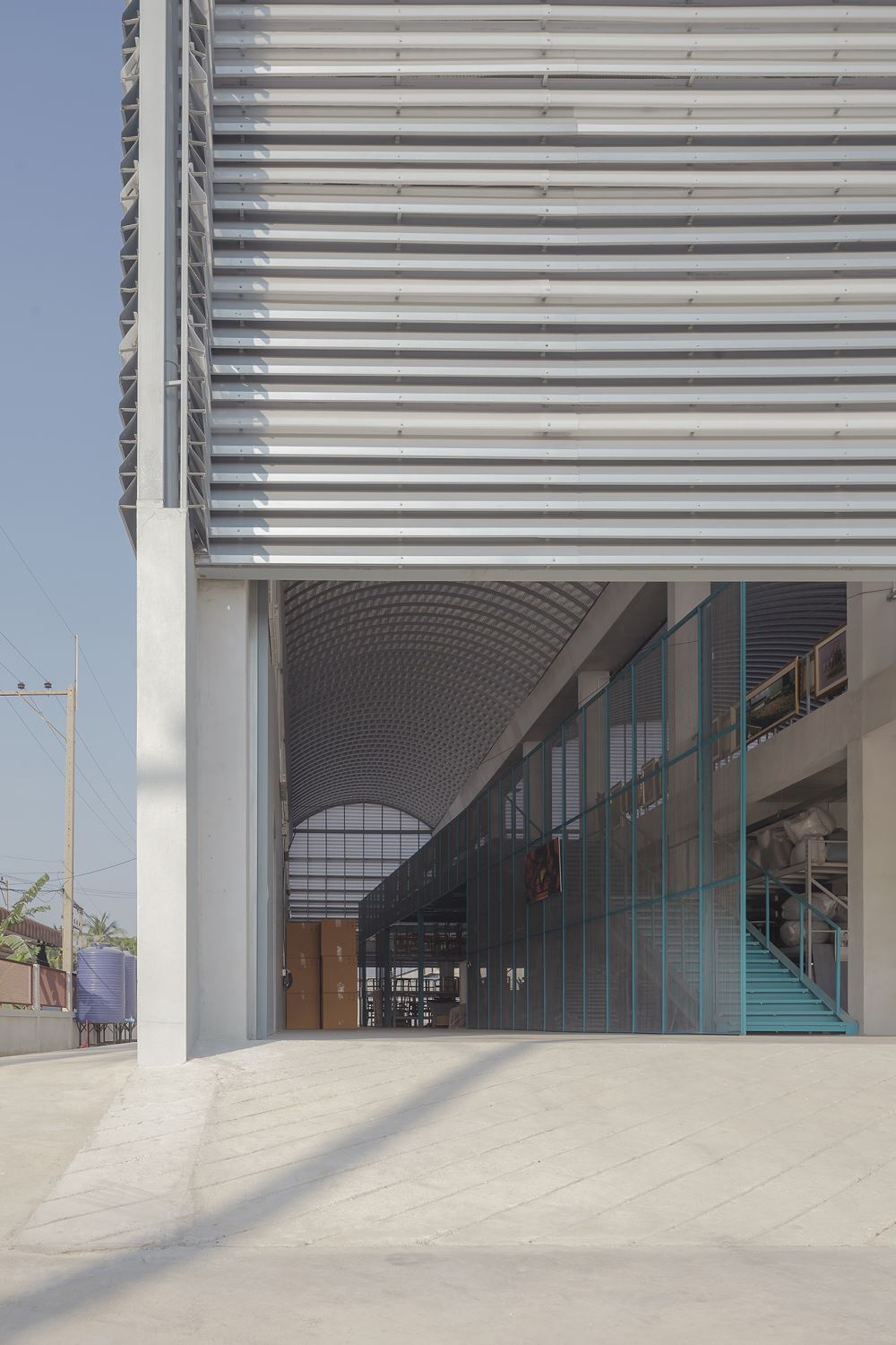 Executed mainly by utilitarian aspects like any industrial type, the new building is roofed with two light-weight structural vaults made of folded metal sheet— a minimum use of material substance for such a long-spanned coverage. The big vault covers the main storage spaces on both levels. The small vault serves as the main entrance and loading area, leading customers to the upper level where the stock is displayed. The building assimilates with its surrounding structure by the application of generic materials widely used on local industrial architecture. Strong tropical light is filtered through the breathing skin of translucent and opaque louvers, allowing a total natural ventilation inside. Thus, energy consumption is zero during the daytime.