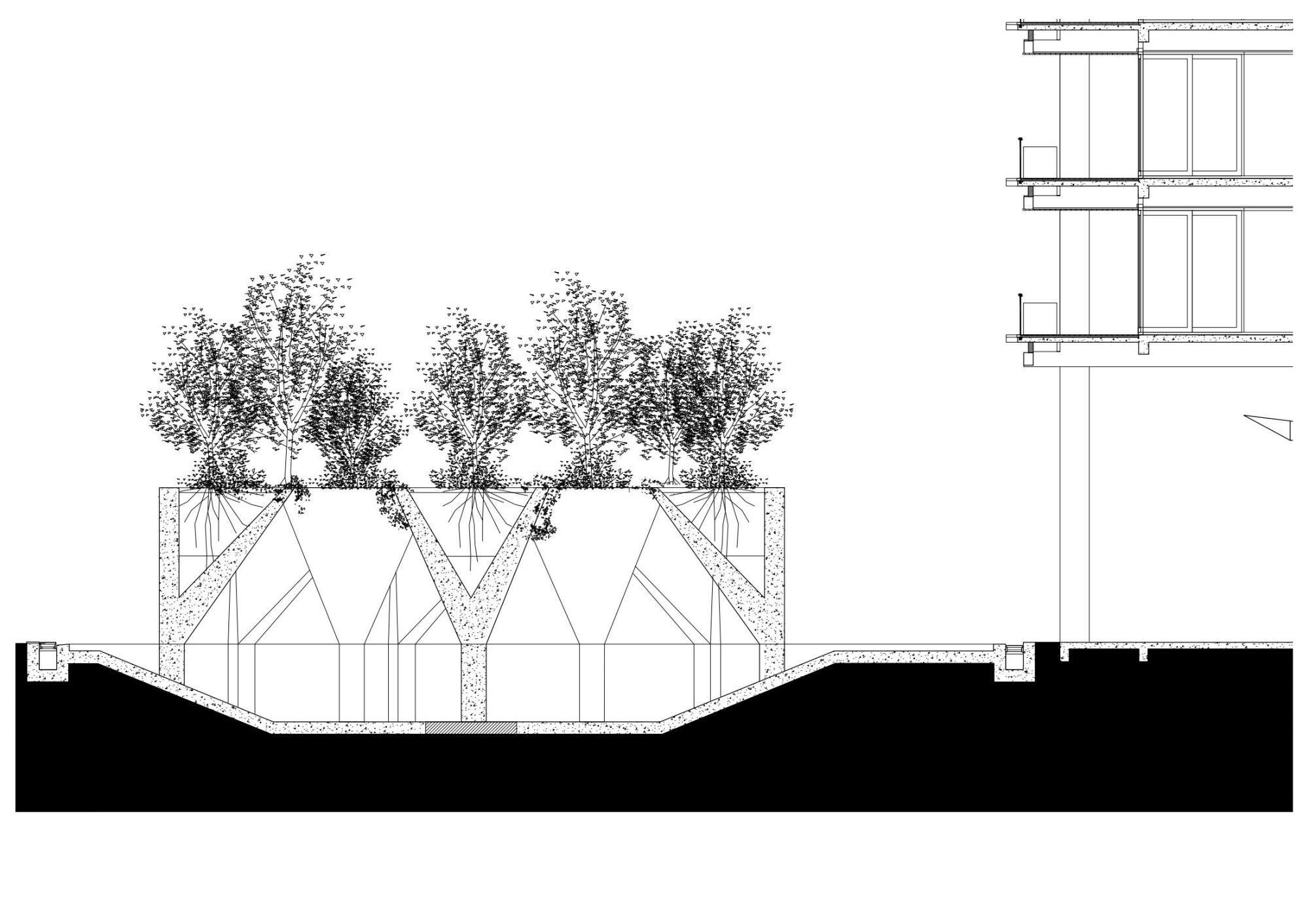 The overgrown Callistemon Viminalis trees on a cast-in-place exposed concrete structure changes the diving scene seasonally and introduces swimmers to a tropical micro-climate bath.