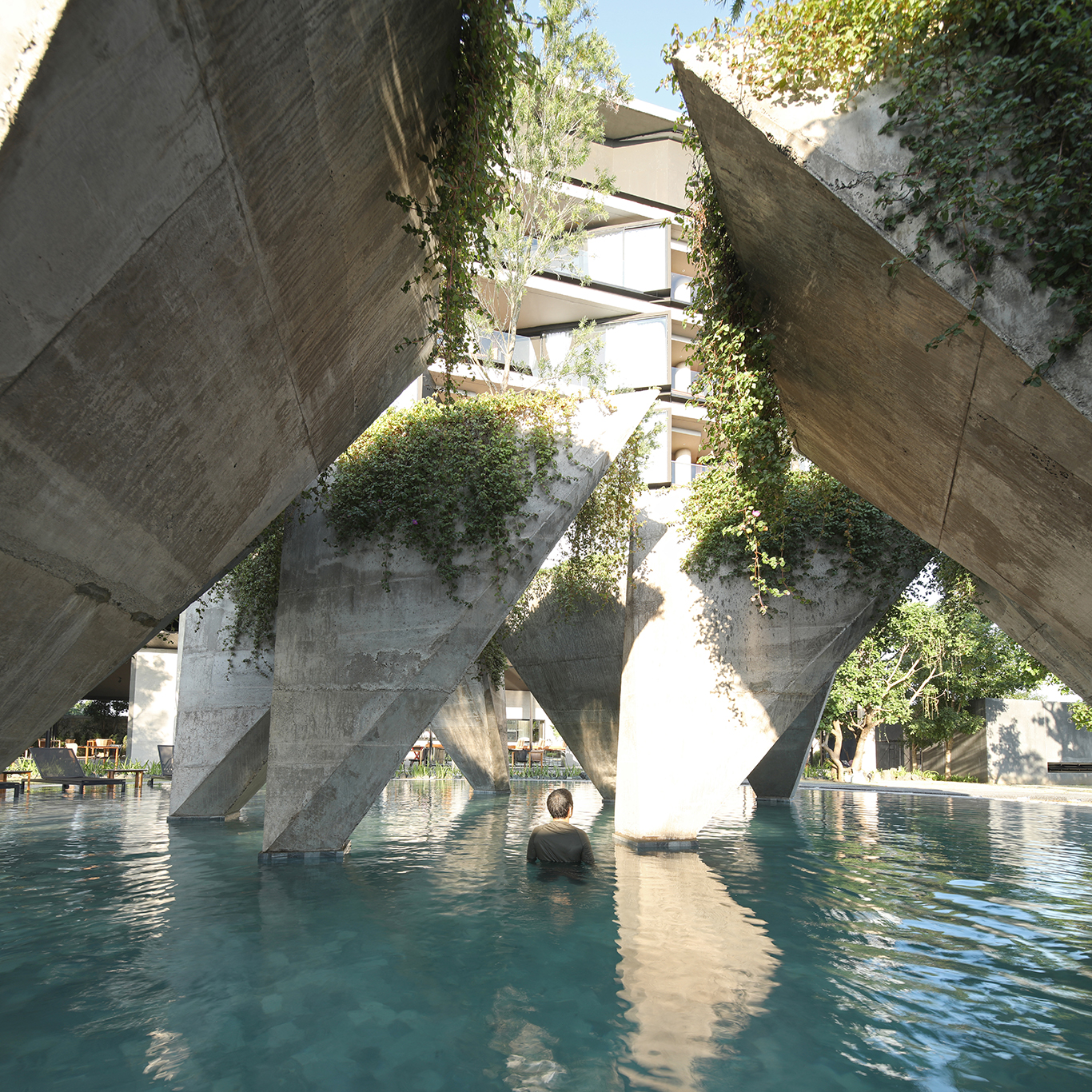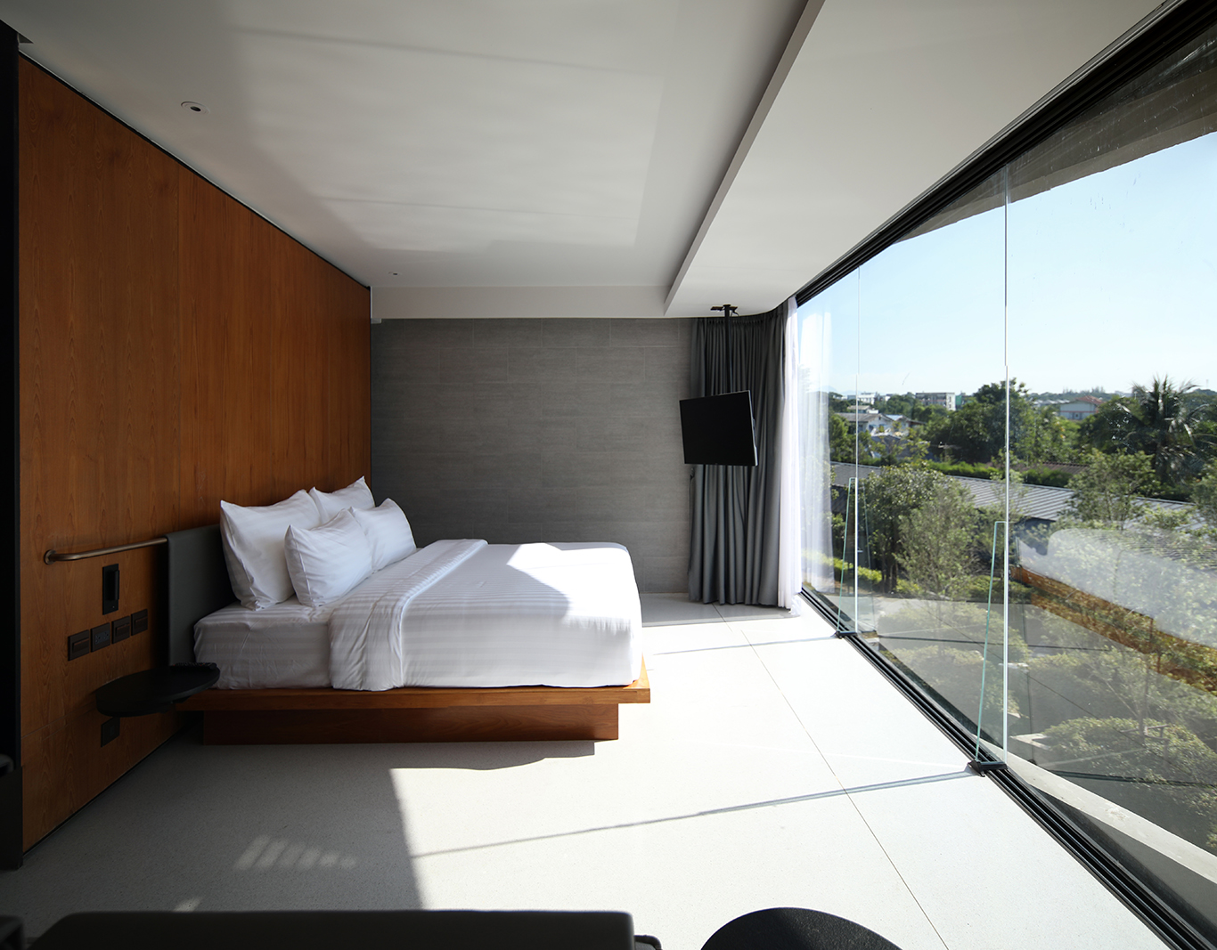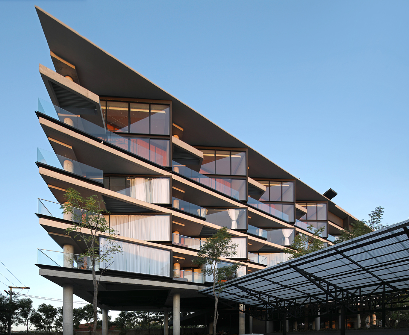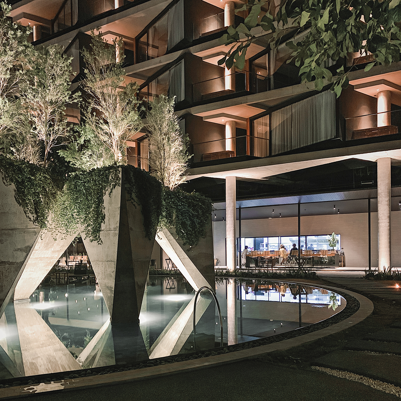 Livist Resort is a city hotel located in the center of Petchabun, situating 40 minutes from natural attraction and surrounded by small local dwellings. The structure is in the garden around the west wings of the hotel, allowing travellers to see Khao Kho's sunset scenery from far. The Open-Air pool was enfolded by a collection of 14 Inverted Pyramid Structure, complementing to grow perennial plants. The span of 3.5 metres allows the sheltered space to breath and formed a conjoined pocket space as swimming experience. Initiating prolonged bathing, enveloped from the top but simultenously airy.
