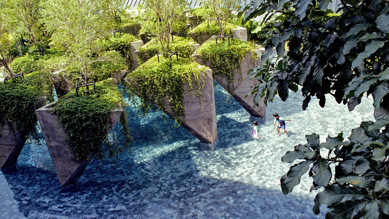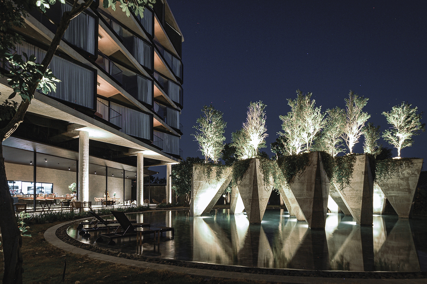 During night time, the submerged planters reflected by a pool, transforms into a light sculpture.