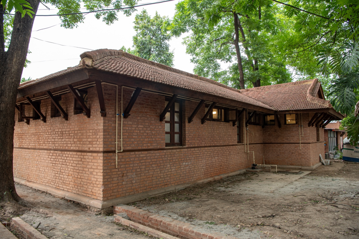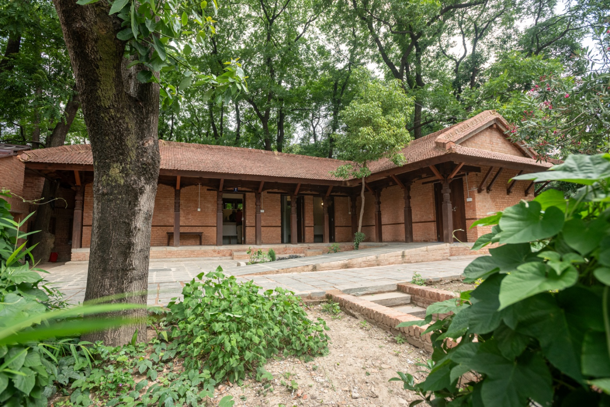 The Plan of the toilet is designed in an L-shaped form to make a front space to get a public frontage and define its enclosure. The southwest section features a disabled-friendly toilet with ramp access. A covered, L-shaped colonnaded walkway connects to the restroom facilities, which include a ladies' toilet with five units, a dedicated breastfeeding cabin, and a gents' toilet with three units and urinals. The platform serves both as a connecting corridor and as a resting area, as is typical in the Phalcā. This small 100 sq m toilet project reflects the traditional Newar architecture, housing a new facility. designed in a traditional load-bearing system using brick masonry walls with timber-framed roofing. The façade is brick-faced with a dominating row of carved timber columns and an overhanging traditional jingati tile roof. The building is made into a low-height human scale to merge into the surroundings full of trees and vegetation. The hip roof also facilitates rainwater harvesting in the area. The color of the building is made natural to merge into the historical context.