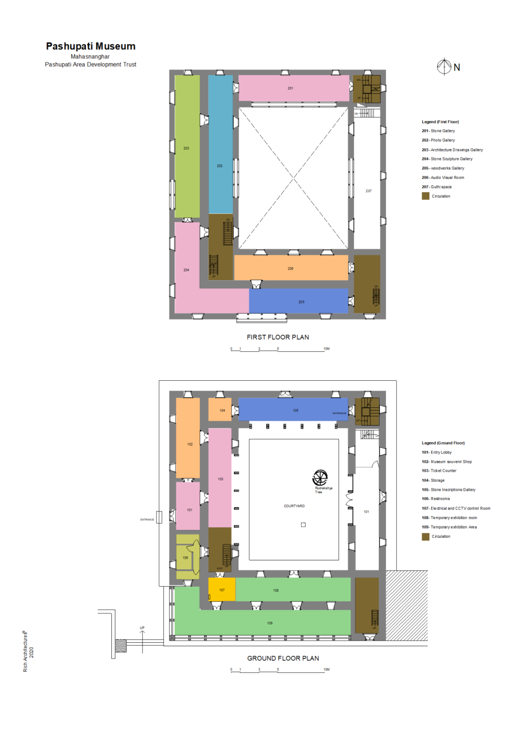 The north eastern stair leads to the first floor, where the northern wing welcomes with the collection of the stone inscriptions and fragments of statues, and a unique Caturmukha linga. The west wing of the first floor houses a collection of historic photographs, maps, and drawings of Pashupati, which includes the largest section drawing of the Pashupati area through the western and eastern gates of the Pashupatinath temple compound drawn by Surendra and Gyanendra Joshi in 1986. The western wing houses the stone fragments like toraṇa, avarana temple pillar, etc., and carved wooden elements ranging from corner struts, carved pillars of different dynasties, toraṇa thā̃, statues, etc. The inner bay of the south wing is provided with an audio-visual room with a capacity of 60 people. The first-floor eastern wing is dedicated to the Guthi rituals with separate access from the ground floor.
