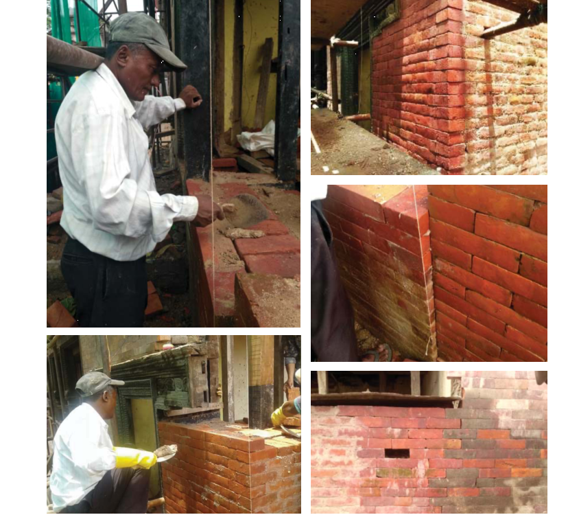 The work addressed structural weaknesses from earlier renovations, including severely damaged masonry walls and floor structures, which were rebuilt to higher standards. The T-joints of the masonry walls were securely built using Lime surkhi mortar and were provided with timber tie bands throughout the wall. Vertical timber posts were also introduced at the corners, tied to the horizontal bands for extra stability. Key interventions included dismantling and seismically reinforcing the eastern wall attached to the Sattal building using timber, removing inappropriate partitions (toilets, kitchen slabs, and storage areas), and repairing leaking roofs for watertight integrity. The south and west wing joists on the second and third floor were replaced with larger Nepali salwood sections for enhanced stability, while inappropriate concrete flooring from earlier reconstruction works was replaced with Lime Surkhi and Telia tiles. The center-to-center spacing of the joists was reduced to 30cm to make the floor stable, and provided with a longer joist was provided with wooden pegs at every fifth joist. Aesthetic upgrades featured 56 carved wooden columns replacing plain ones, lime-plastered walls, and warm lighting to complement the heritage ambiance. The exterior face wall of Dāchī appa was repaired to make it seamless by using expert masons from Bhaktapur. The carved doors, windows, and stairs were finely repaired, secured, and missing parts were recreated by the master wood carvers also from Bhaktapur.