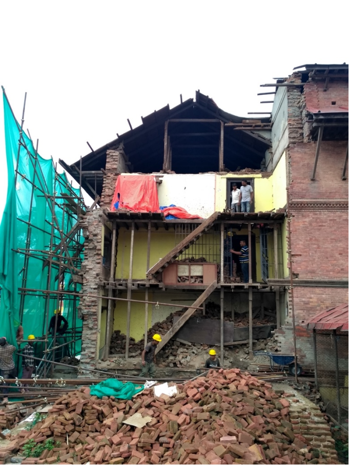 The 2015 earthquake caused severe damage to Mahasnanghar, particularly affecting its upper floors and eastern section. The most significant destruction included: the cracks of the eastern gable wall, which was attached to a sattal, structural failures around doorways and window openings, with cracks and dislodged masonry, severe damage to the roof structure, compromising its stability. and widespread cracks in walls and floors, resulting in partial collapses in certain sections. The earthquake left the building in a fragile state, with its load-bearing masonry walls fractured and crumbling, necessitating urgent conservation efforts. To restore the building, the Pashupati Area Development Trust (PADT) initiated the project with funding from Nepal Investment Bank Limited. The overall restoration project was completed in three phases.