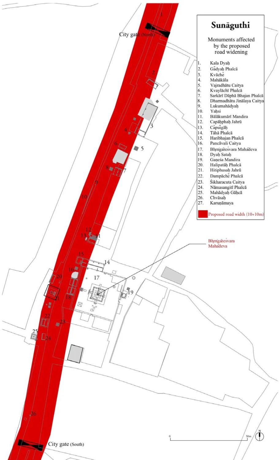 27 Monuments recorded along a street in 800 meters, red marks denote the width of proposed road widening threat to the heritages.