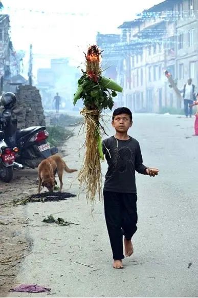 A young boy holding burning straw to throw the demons away from the city.