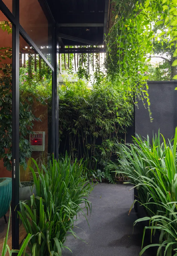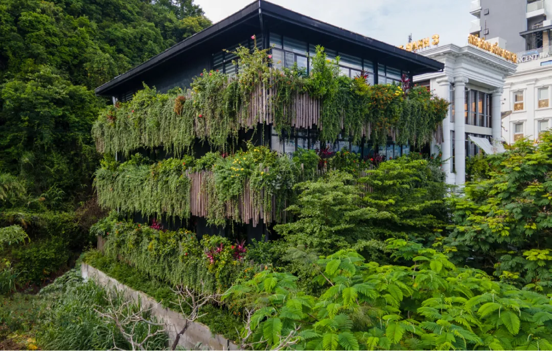 The facades around the building feature balconies with plants, creating a green envelope that not only impresses from the outside and harmonizes with the surrounding scenery but also provides shade, resulting in a cool and comfortable space inside. From within, one can see an interwoven array of plants and flowers, including herbs, ornamentals, and a variety of colorful species, forming a rich and appealing tapestry of vegetation.