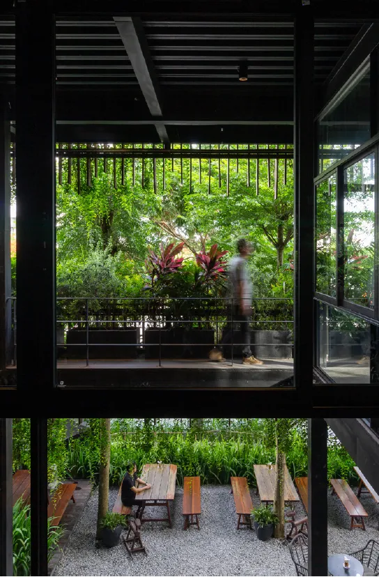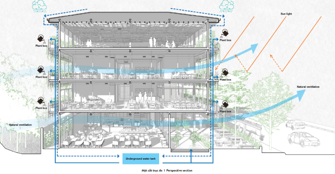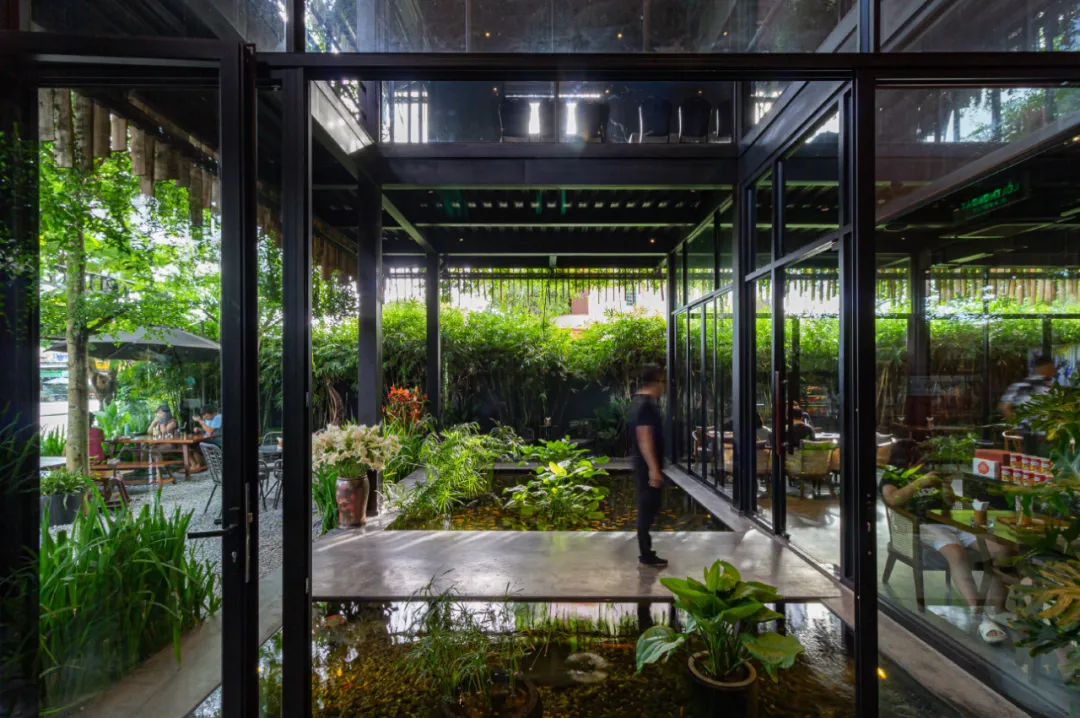 The first requirement is that the project needs to be built and completed within a short time frame (about 4 months) with a usable area of over 1000 m2. We have decided to choose a model with a simple structure, a prefabricated steel frame as the main structure, and glass sliding doors that can be opened and closed to create spaces that are both private and connected. The vertical surfaces are made of glass to increase the view around and create transparency for the building. To create a natural, quiet space, while also reducing heat radiation for the building, we have created a facade with simple wooden slats and a system of greenery surrounding the usable spaces.