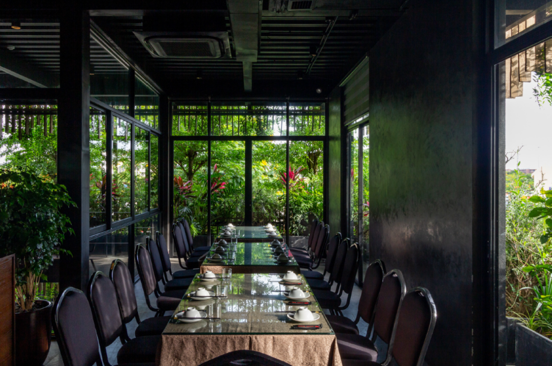 On the first floor, the entrance is led by a small corridor lined with green bamboo trees, from there opening up a garden in front of the building. Here, you will find a garden with many types of trees arranged at different levels that all blending together. These will give you a cool, quiet and pleasant atmosphere, even though the project is very close to major roads. In the garden, there are a few sets of wooden tables and chairs, you can sit and drink coffee under the trees, and look at the road through the fence wall made of large glass panels. These glass panels not only serve to block out noise and dust from the outside but also do not obstruct the view from the inside.