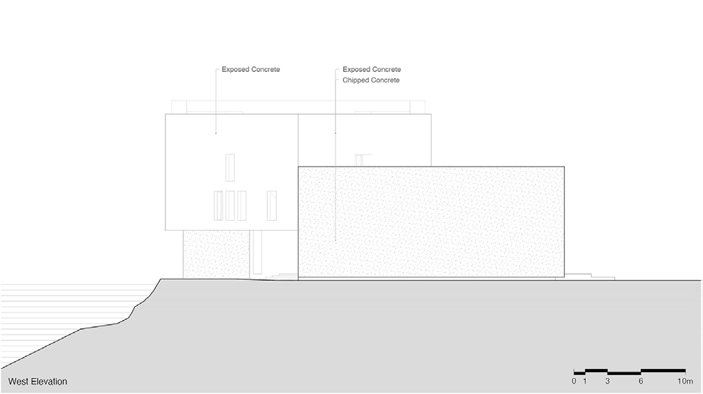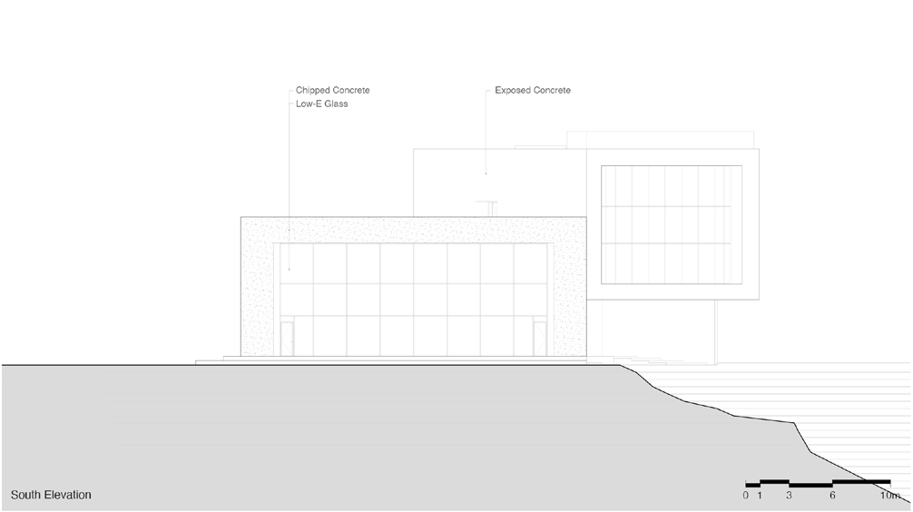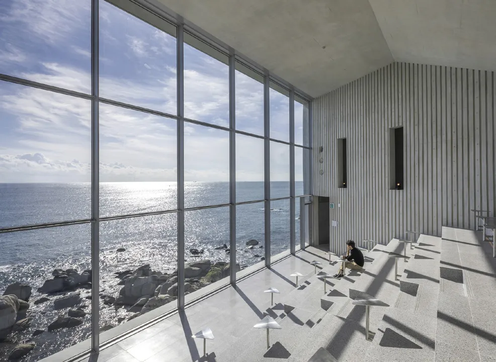 The Ocean Cinema, a 20x9.8m frame facing the East Sea, is a highlight of the project. It features tiered seating to allow unobstructed views, enabling individuals to fully immerse in the ever-changing sea. To enhance this dramatic sequence, the approach includes a monochromatic, enclosed corridor that amplifies the subsequent impact. The viewing frame uses a steel curtain wall, minimizing bars and maximizing the field of vision. The grey exposed concrete of the Ocean Cinema reflects natural hues, turning fiery red during sunsets, allowing visitors to experience nature’s transformations. Monotone stainless steel fixed tables are meticulously designed to be functional while maintaining the immersive atmosphere of the space.