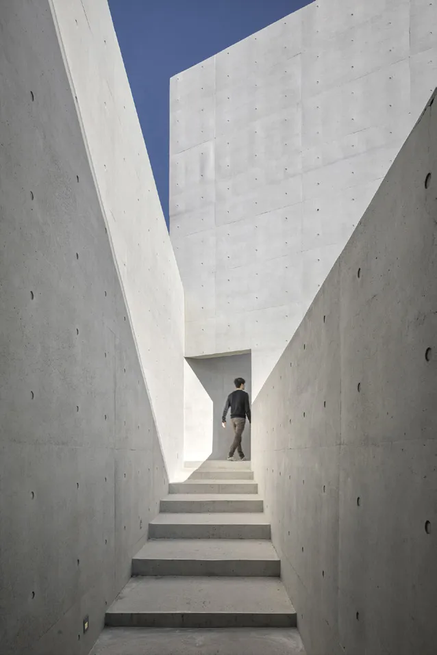 Situated on a low hill with views of the East Sea and a small fishing port, the project utilizes triangular spaces to enhance and differentiate these vistas. The design reinterprets the textures of the on-site granite rocks into chipped concrete facades, blending with native grasses to mirror the seaside landscape. This approach not only integrates the building with its natural surroundings but also reflects the cultural and environmental context of the area. Culturally, it transforms this suburban site into an ideal retreat café, providing a peaceful escape from urban life and a space for personal relaxation, which is especially significant during the COVID era. Environmentally, the triangular shapes improve natural light and ventilation, reducing the need for artificial lighting and cooling systems.