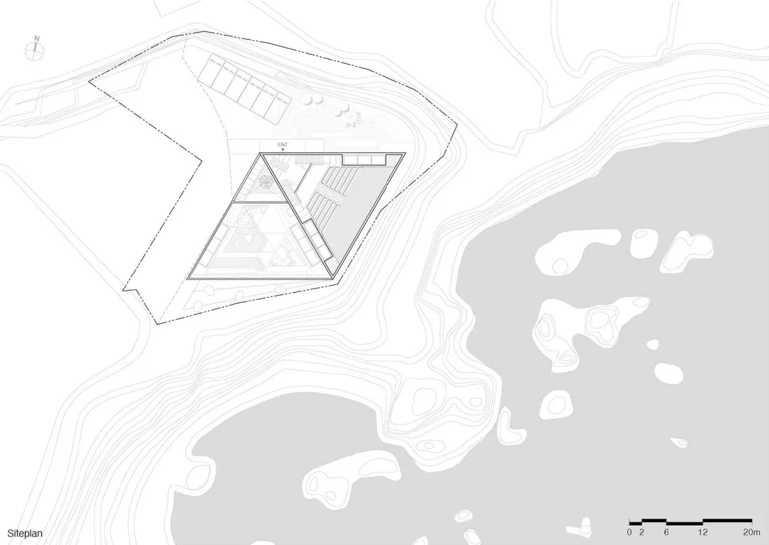 The “Innovative design features four vertically arranged triangular spaces, each providing distinct perspectives and spatial experiences. Circulation paths along the hypotenuses guide visitors to various viewpoints, ensuring unobstructed sea views. The project exemplifies how thoughtful geometric design and spatial organization can create a visually appealing, functional retreat that promotes social interaction and relaxation in a post-pandemic context.