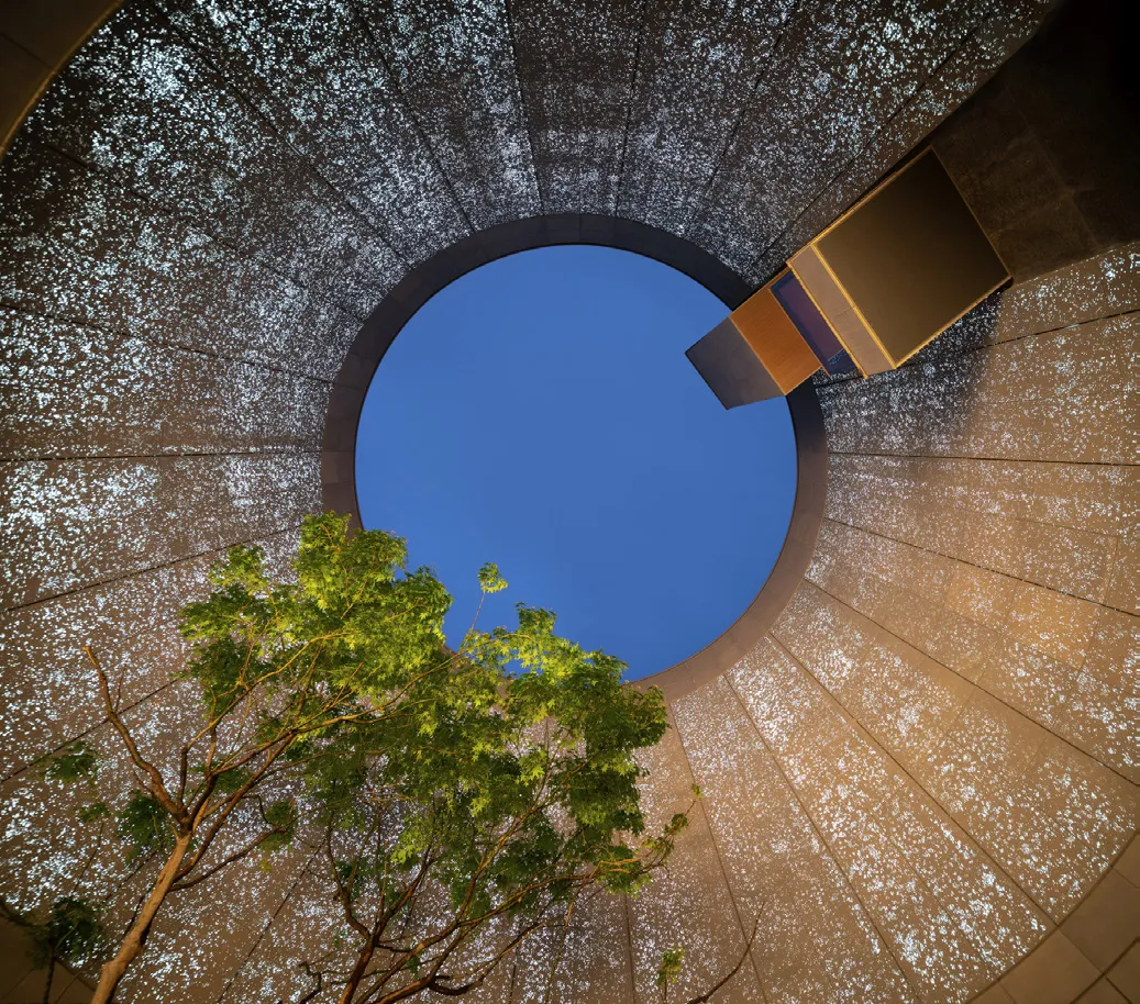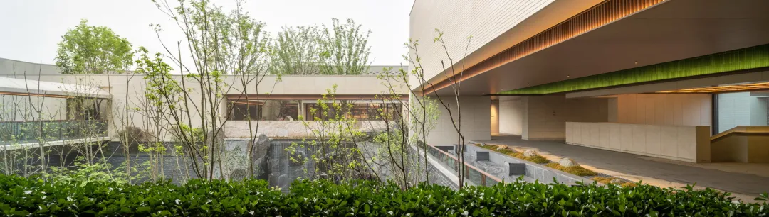 The change in spatial scale at the drop-off creates a progressive visual sequence: the expansive outside view is framed by the large canopy, further narrowed upon stepping into the entrance, and unfolded while approaching the courtyard; the light is synchronized with the view, from bright to dark, and then becomes more glowing in the courtyard, with natural light permeating through tree canopies, revealing an especially vivid scenario in the contrast.