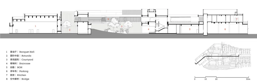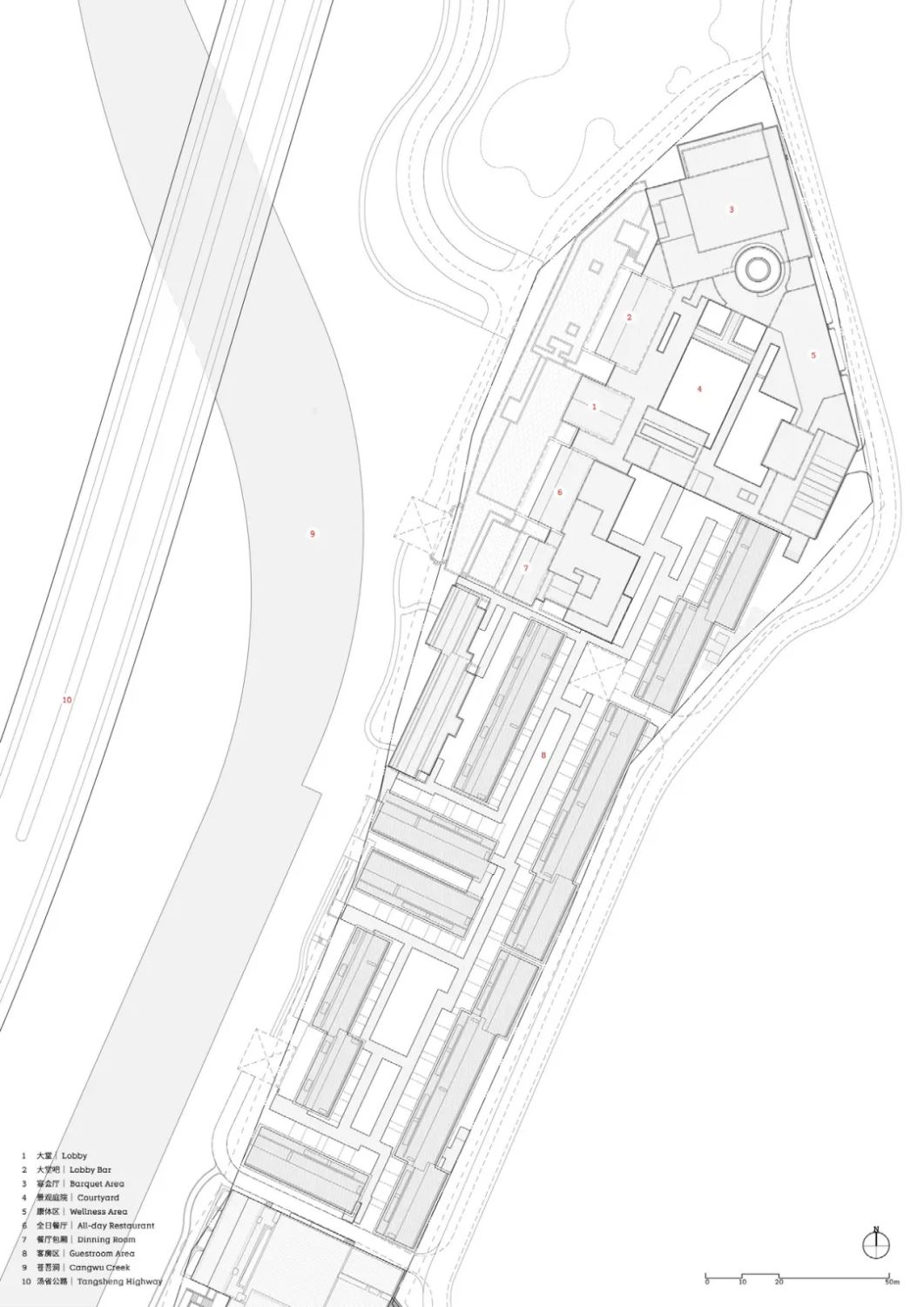 The hotel is located on a sloping site with an elevation difference of more than 8 meters. To adapt to the terrain, the slope is cut into two platforms on different levels. Most public areas are at the same level as the guest rooms, allowing a continuous walking path.