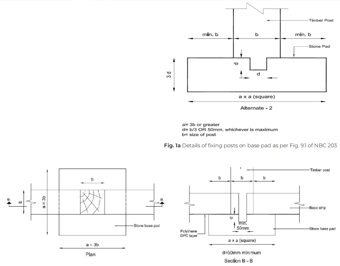 Fig. 1 a) Details of fixing posts on base pad as per Fig. 9.1 of NBC 203, b) Details of fixing a series of posts on base strip as per Fig. 9.2 of NBC 203