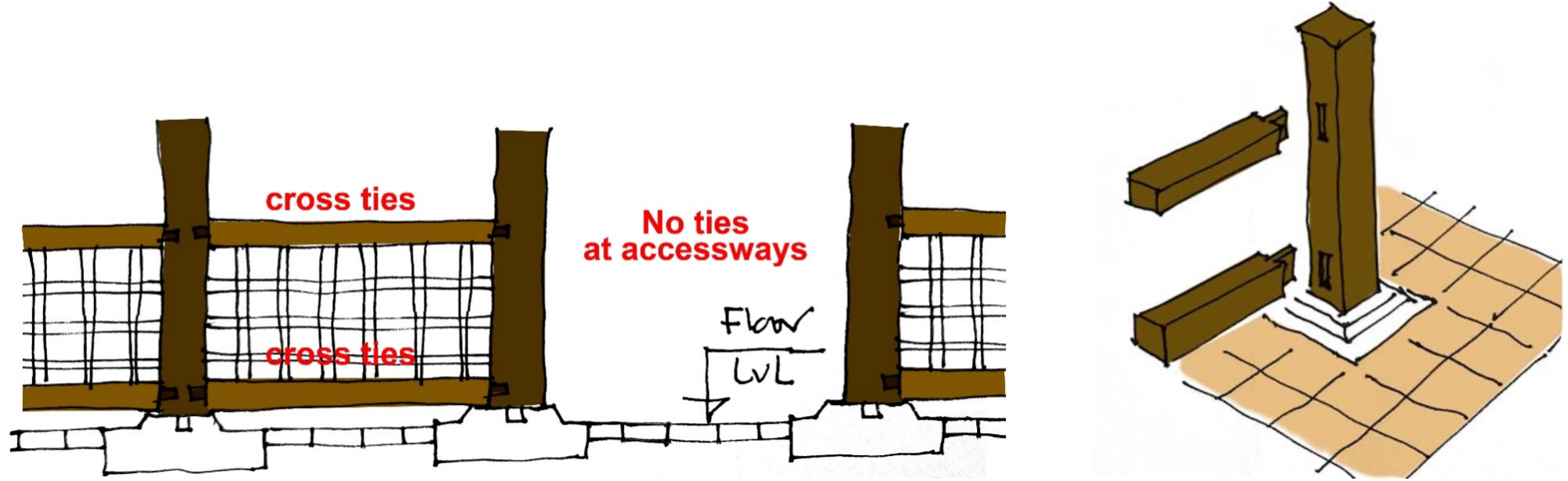 3. As per the suggestion for moderation received from the prominent experts, the columns need to be tied so that they perform well even in the case of high vertical uplift during an earthquake. For this, it is recommended to provide tie bands tying the columns on the bays which bear enclosure, and which are not used as accessways, as shown in Fig. 11a & 12. These ties are to be skipped where the doors are planned and in the middle row of columns in the Guitabahī.