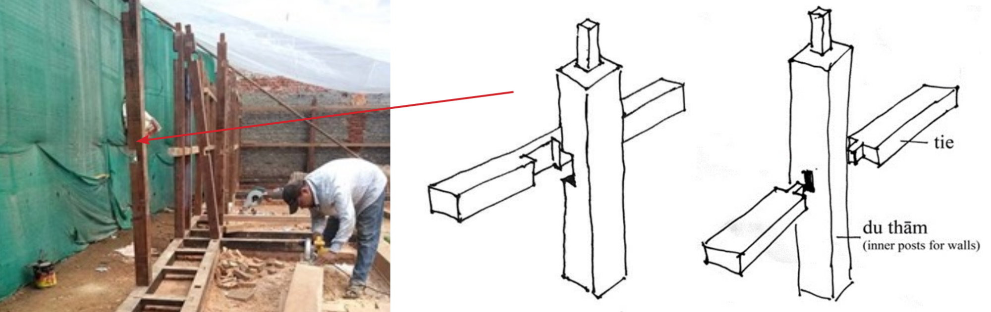 The vertical du thāṁ (post) and horizontal ties are seen here to be cross-lapped using a half-lap joint at intermediate levels, which is a flawed detail. This will not protect the masonry wall from out-of-plane failure or delamination. The intervention on the vertical posts should be kept to a minimum as far as possible. While in this project, the slots for a half lap at intermediate levels of the vertical du thāṁs (see Fig. 13a) will only reduce the structural integrity of the post. Instead, it is recommended to provide tenon and mortise as shown in Fig. 13b to address the abovementioned issue.
