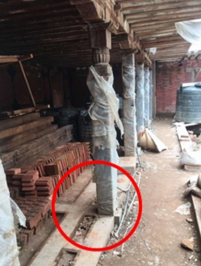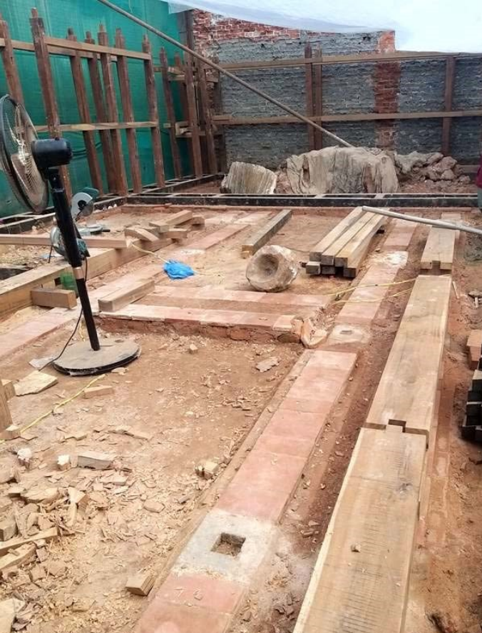 On the ground floor of Prathamaśrī Mahāvihāra and Gustala Mahāvihāra, the existing ilvahaṁ (saddle stones) were being lowered from their original level/elevation, only to bury them into the ground and top them with horizontal lākāmsiṁ (a wooden base runner) to be finished at floor level. And the vertical wooden posts were planned to be placed upon this horizontal lākāmsiṁ or the base runner. Laying horizontal lākāmsiṁ atop the existing ilvahaṁ (saddle stone) is not only inconsistent with the traditional detail but also is not a good practice from the standpoint of building science and engineering principles. (see Fig. 7 & 9)