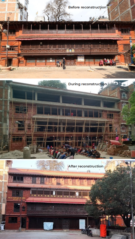 Rank 2: Projects in this category typically invest considerable effort in design and documentation, and attempt to replicate the visual appearance of the original structures. However, they introduce significant structural interventions that deviate from traditional construction knowledge, architectural detailing, and building processes. While the buildings may visually resemble the original form to some extent, but application of modern engineering approaches and other interventions undermines the original structural ingenuity and heritage value. Examples include Jyābabahī, Guitabahī (2021-2025).