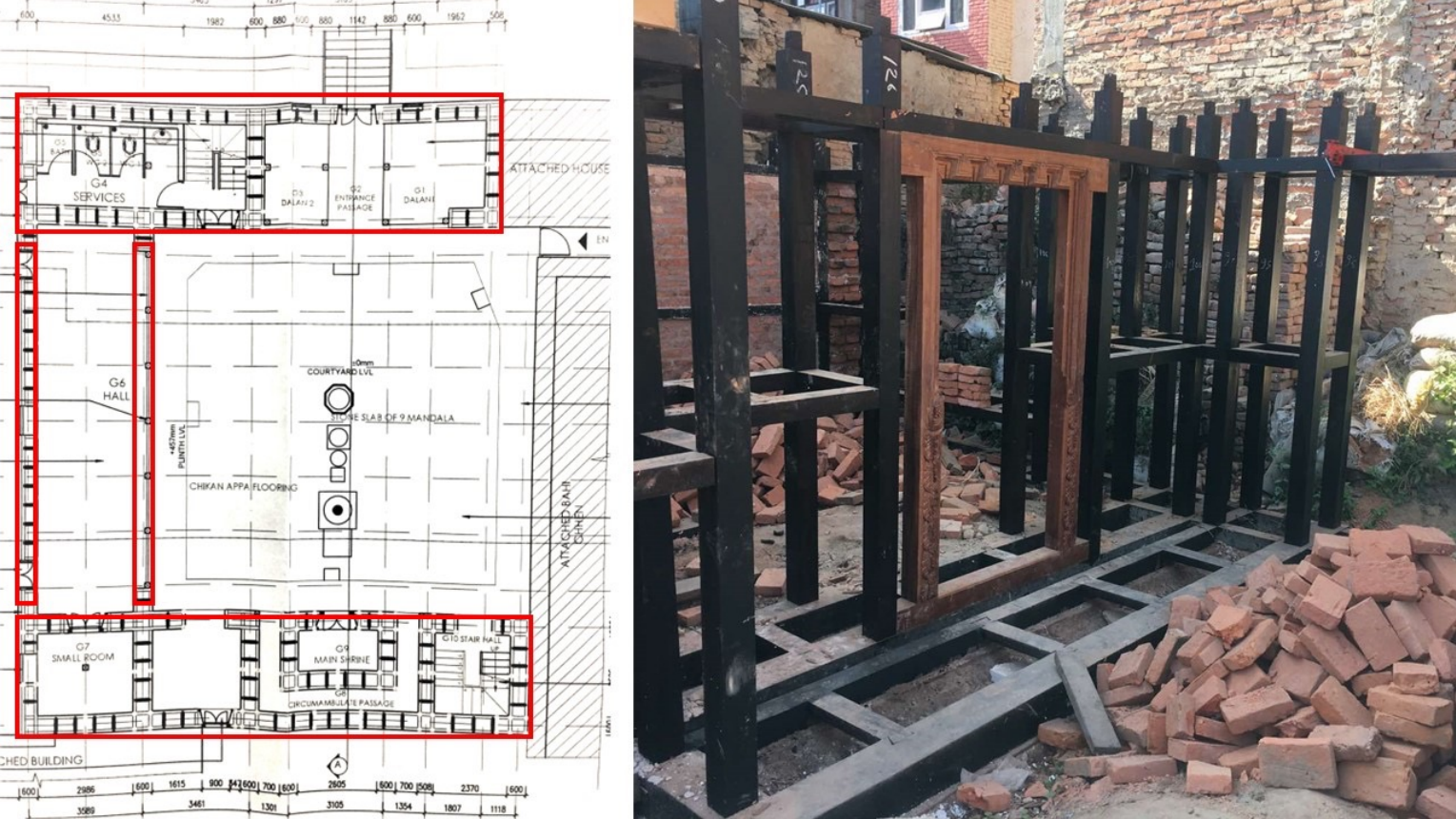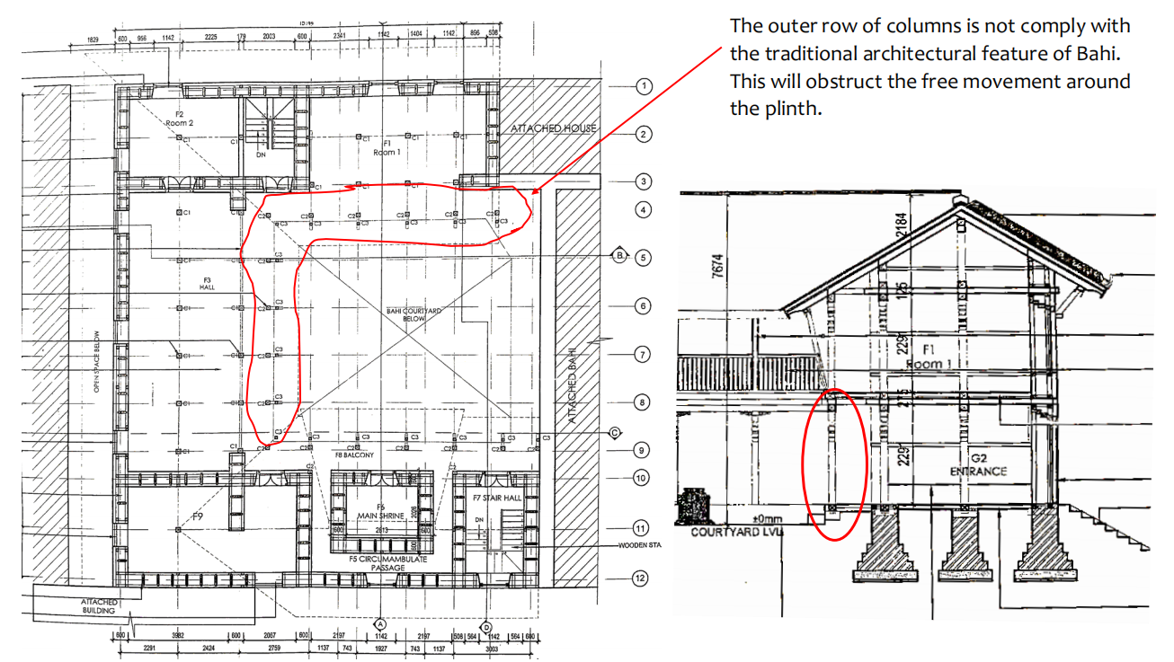 The design of the Gustala Mahāvihāra was changed, and the community was taken aback when it was already implemented at the site. The most objectionable change was the introduction of the seismic gap, stating that NBC does not allow to construct buildings in a C-shape without a seismic gap. With this erroneous intervention, the western wall becomes isolated from the north wing and south wing, making them even more vulnerable. The idea of inserting a seismic gap is not a traditional practice at all.