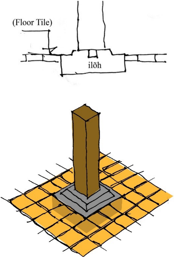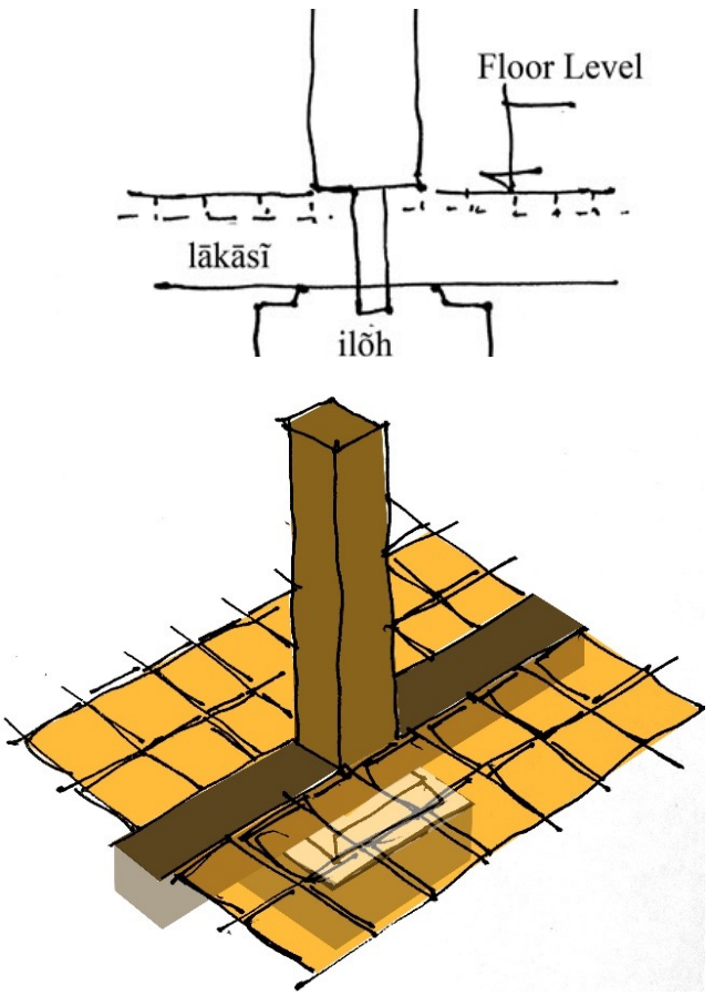 In traditional construction, ilvahaṁ is meant to bear vertical upright columns. An approximately 1.5" high sloping crown/apex on the ilvahaṁ (see Fig. 8), which acts as the base of the upright column, slightly raises the base of the column from the ground level so that any moisture on the ground would not easily find its way to the base of the column thus preventing the case of wet rot. But the proposed detail in Guitabahī with the base of the column right at the ground level would let the moisture into the base easily, thus creating a favorable environment for wet rot (Fig. 7 & 9). The technical team involved might have been misinformed and misled about the floor tiles being waterproof (actually, they are not). This might have led them to think of lining the base runner with floor tiles to prevent cases of wet rot. This was a totally wrong idea from the very outset. The complaint on the issue of possible damage to the wooden member underneath the was also issued by the community in writing, which was rejected outrightly by the designer, stating that it is not possible to implement.