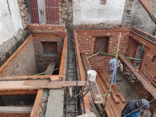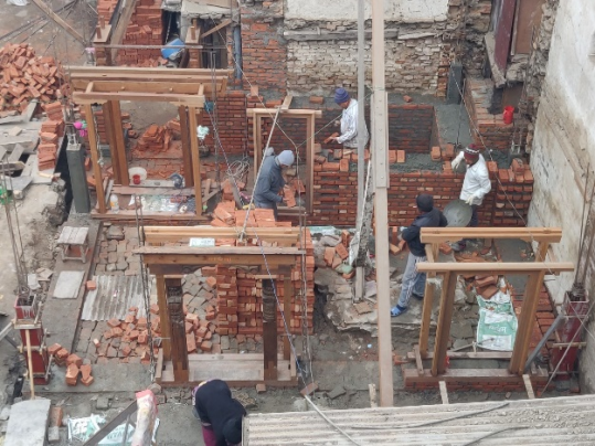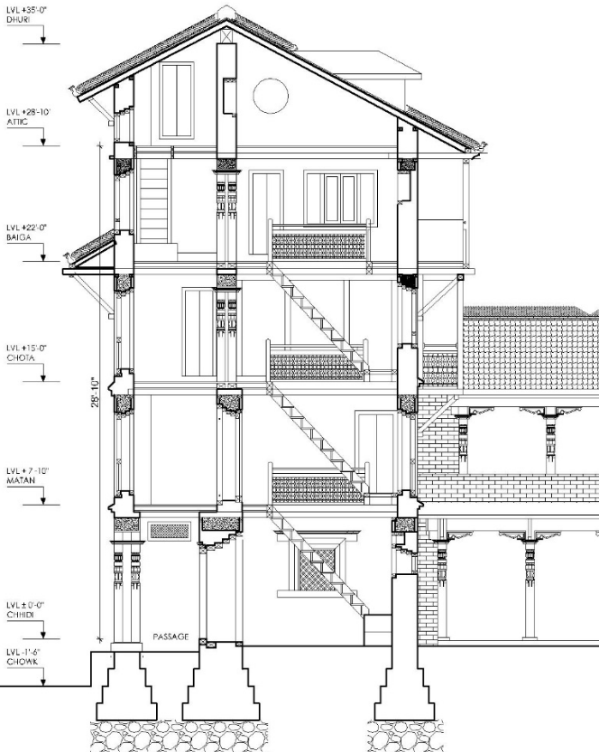 Initially preferring mud mortar for the brick masonry walls, the regulatory constraints limiting the structure to two stories made it to work on cement mortar to achieve the desired layout extending the house to three and a half stories while complying with building code structural requirements. This approach helped maintain the distinctive features of various floors in a traditional Newar house such as the ground floor as "Chhidi", first floor with private rooms as "Maatan", living room on the second floor as "Chota" while the uppermost level as "Baiga," with the attic space (Dhuri) over it. Each floor was connected with a single-flight timber stair. Balconies on the second and third floors provided a direct view of the backyard. The interior spaces cleverly integrated wooden pillars, wall cabinets, and 'Gwakhan' openings, enhancing functionality and creating a vibrant atmosphere.