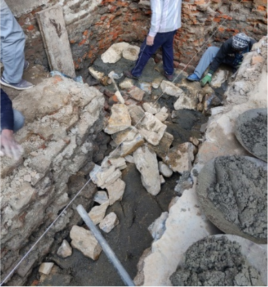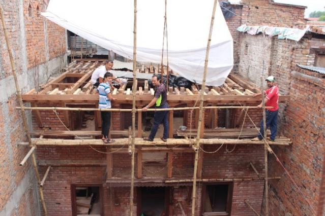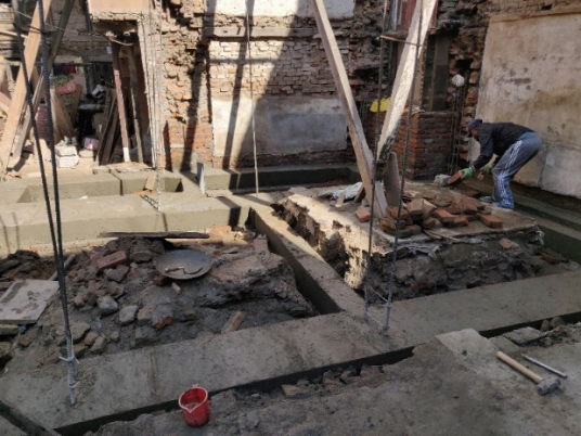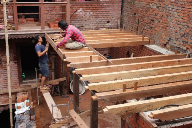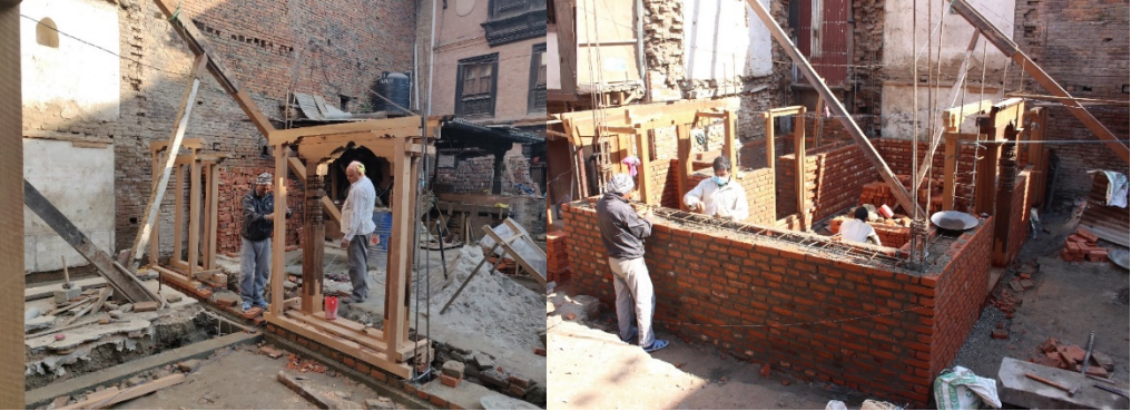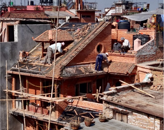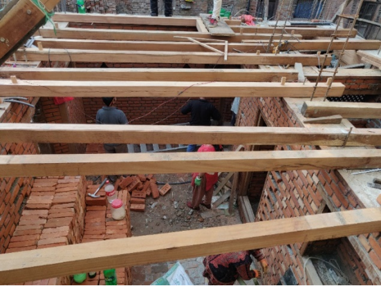 The preservation of the authentic Newa architecture along with earthquake safety requirements was balanced while reconstructing this house. To comply with Nepal's earthquake-resistant building codes, which recommend cement mortar and reinforcement bars for taller buildings, modern materials and techniques were employed along with timber structure during the reconstruction. This decision aligns with both safety regulations and the preservation of traditional elements. The use of cement mortar, brick masonry with steel reinforcement, and concrete bands vertically and horizontally, not only strengthens the structure but also improves its resilience. This approach prioritizes the safety of occupants in a region prone to earthquakes. Additionally, the incorporation of timber members, such as beams, columns, and trusses, known for their strength and durability, adds inherent structural stability. Traditional joinery techniques, like mortise and tenon joints, dovetail joint and other mitered and rebate joints further enhance the building's integrity. The flexibility of wood allows it to absorb and dissipate energy during seismic events, reducing the risk of structural failure. This, combined with the fibrous nature of timber, provides resilience as the material can deform and adjust under stress without compromising stability. The reconstructed house maintains its historical and cultural significance by preserving the traditional facades, timber carvings, load-bearing walls, and other traditional components. Adhering to Nepalese building codes ensures the structure's safety, while the integration of modern and traditional techniques, such as interlocking timber elements and steel reinforcement, adds strength. These codes are informed by scientific research and lessons learned from past earthquakes. The incorporation of steel reinforcement concrete bands vertically and horizontally in the masonry construction further fortifies the house against seismic forces.