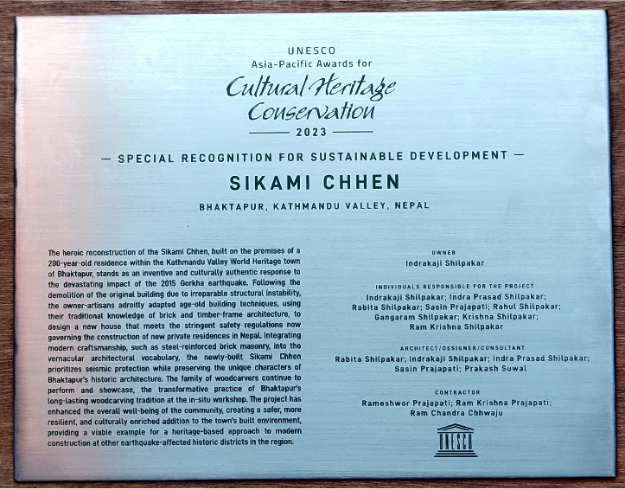Sikami Chhen stands not just as a reconstructed house, but as a testament to the enduring spirit of tradition, art, skill, and innovation, all coexisting harmoniously under one roof. Because of its transformative practice of reconstructing the house after the 2015 Gorkha earthquake by preserving its historical context and traditional form, Sikami Chhen was announced as a special recognition for sustainable development in the UNESCO Asia-Pacific Awards for Cultural Heritage Conservation 2023.