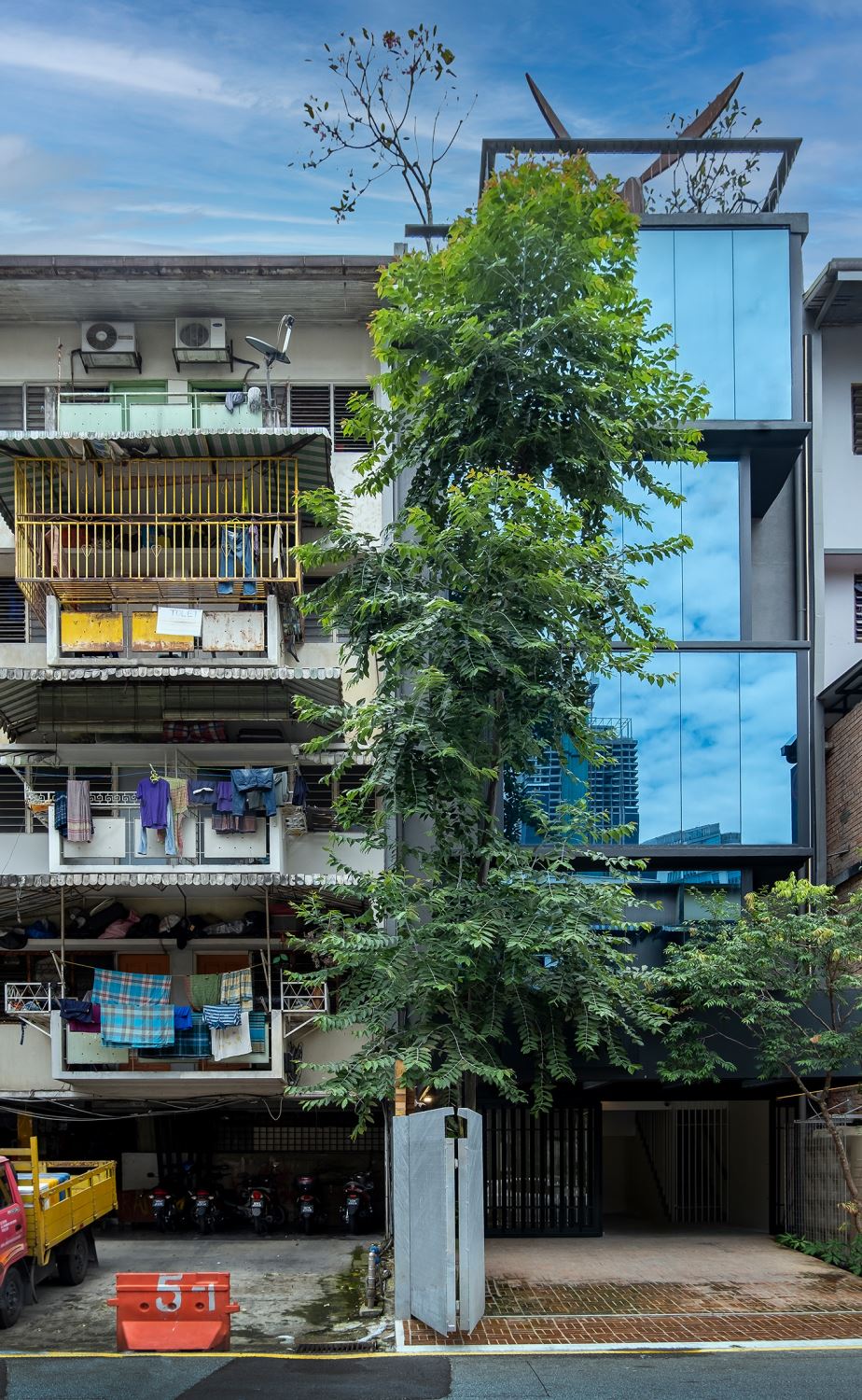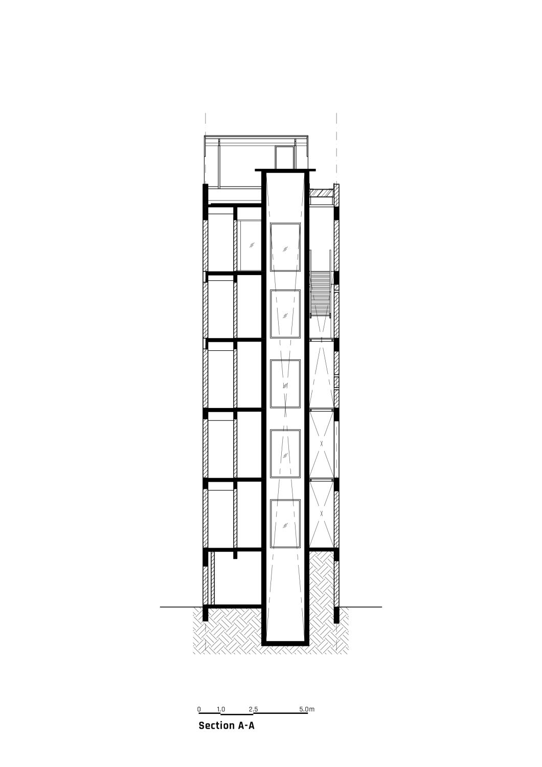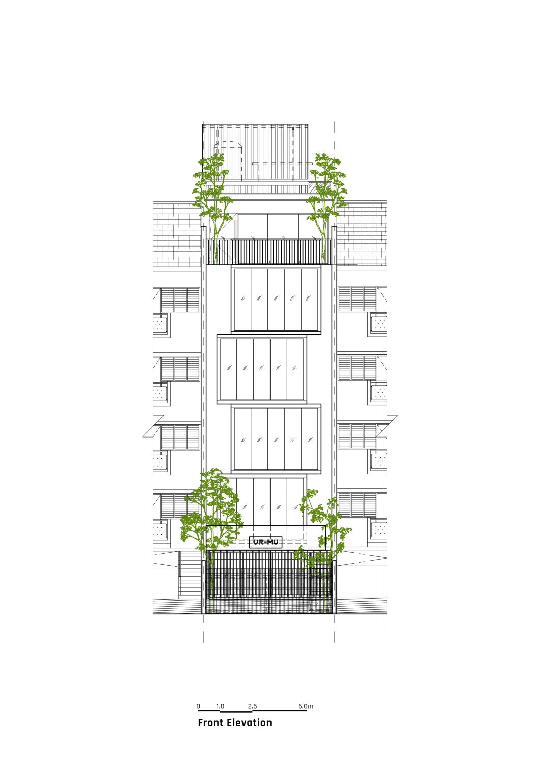Ur-Mu is housed in a 1950s modernist four-storey walk-up apartment building comprising eight two-bedroom fats; the original layout remains intact, with additions including a lobby, roof-top garden, lift, washroom for the disabled, and new façade.
