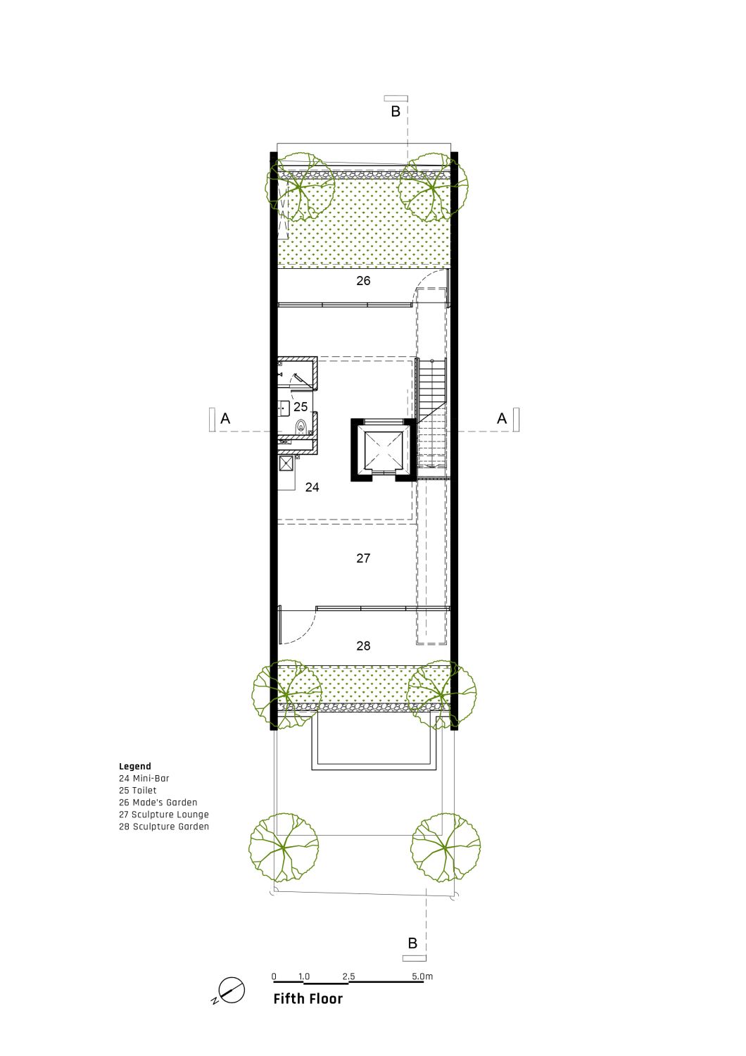 The rooftop garden is called "Made's Garden". Adopting Made's design philosophy of embracing architectural ideals and the splendour of tropical fora, coupled with breathtaking views, constitutes the success of Balinese gardens. In the interior section of the rooftop is the "Sculpture Lounge," featuring an eclectic selection of freestanding three-dimensional artworks, wall sculptures, and two-dimensional artworks.