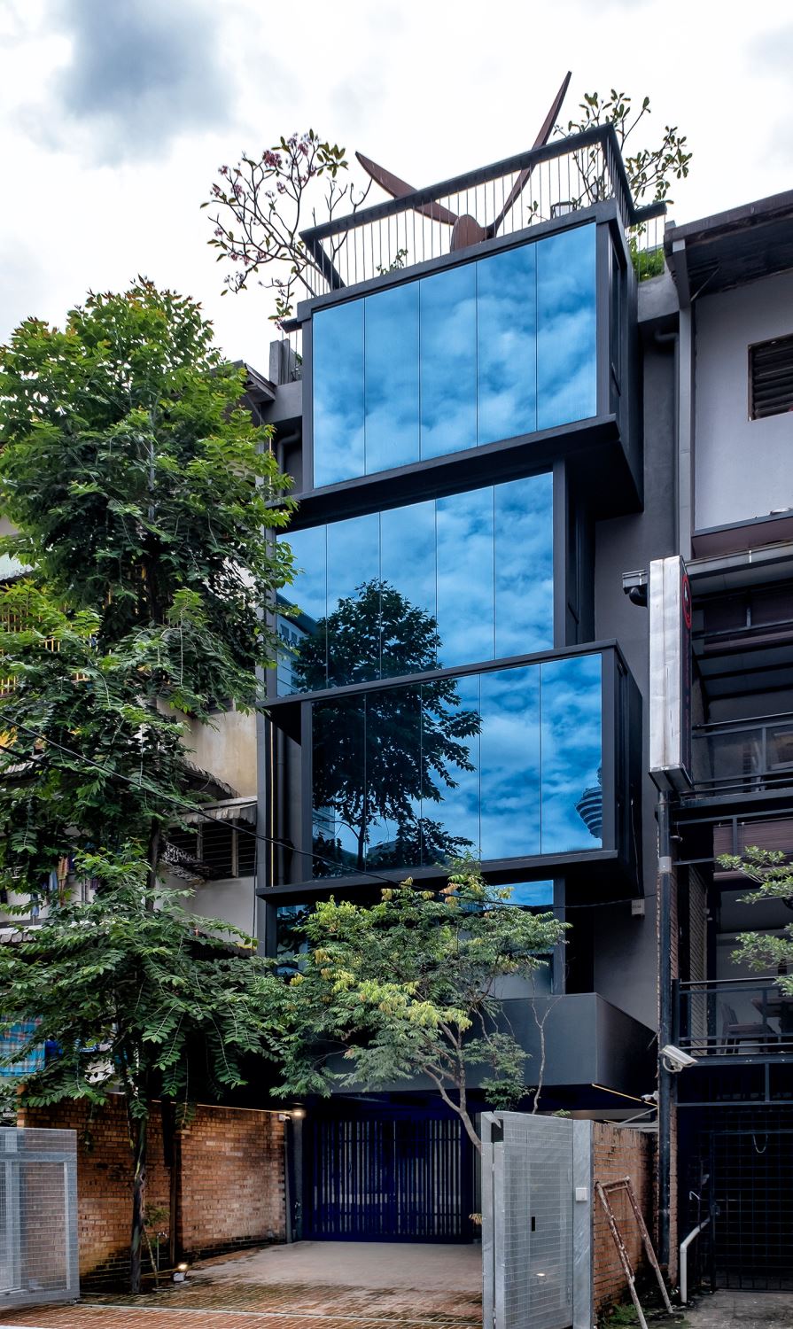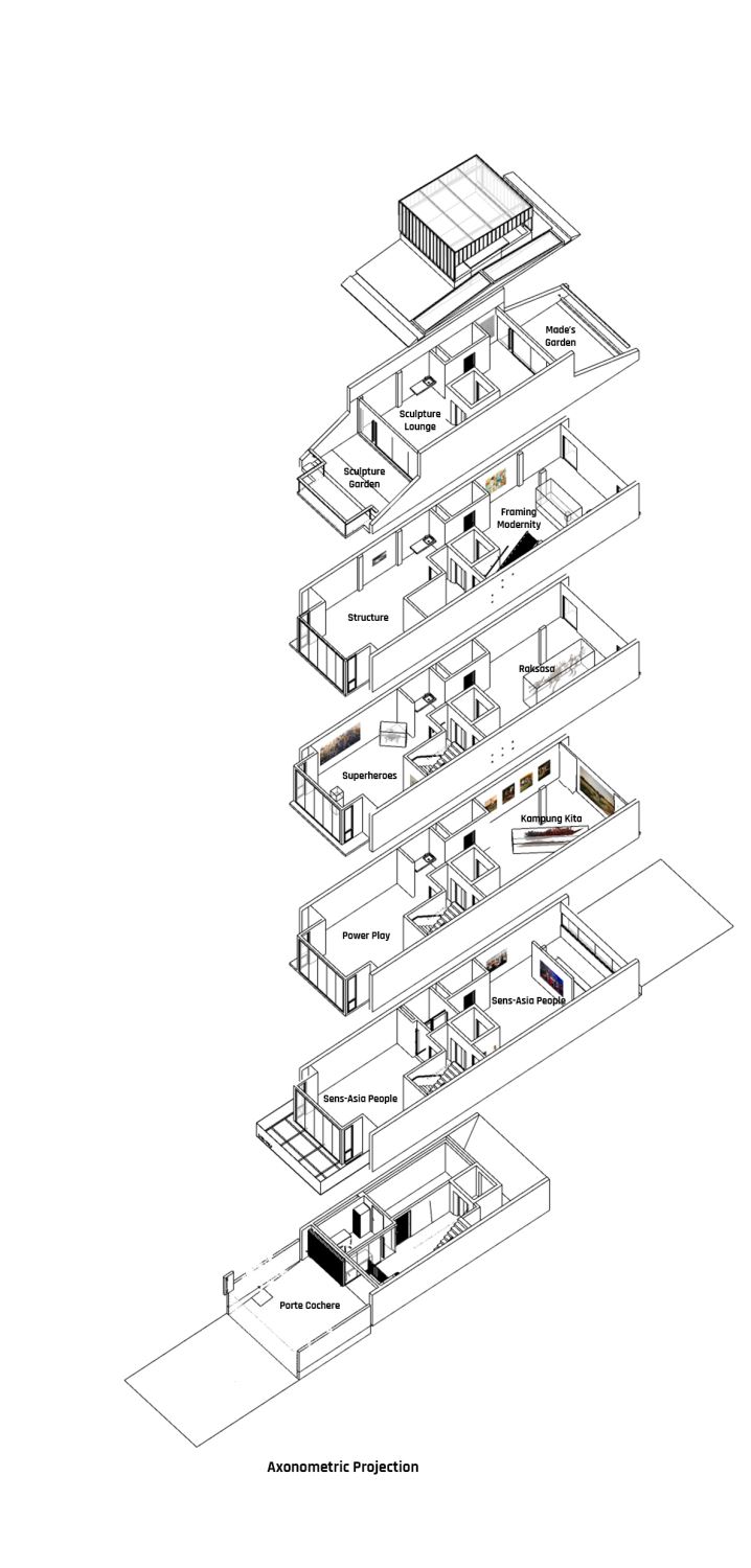 The industrial steel and r"ed brick entry and modern staggered glazed cubic form immediately stand out from the rest of the neighbours, but still pay homage to its surrounding scale. It ofers a glimpse of how the low-density urban townscape might evolve in the future. The museum, which displays the collector's eclectic taste, features over 100 artworks by artists mainly from Malaysia as well as from the surrounding region.