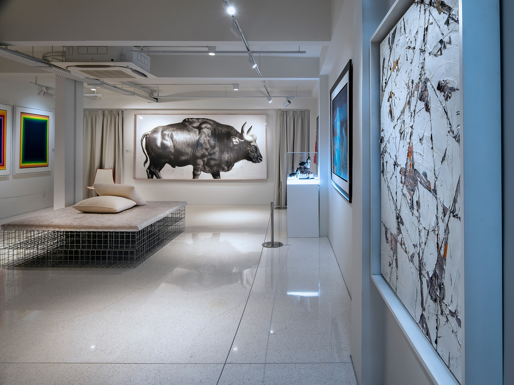 The experience at Ur-Mu has been designed to keep each visitor in mind, making it a space that is accessible to all. Each foor is divided into two sections. Categorised thematically, the artworks have been curated for the sections on every foor in accordance with their corresponding narratives. As visitors enter the lobby on the ground foor, a Banksy welcome mat on the ceiling provides an unconventional greeting.