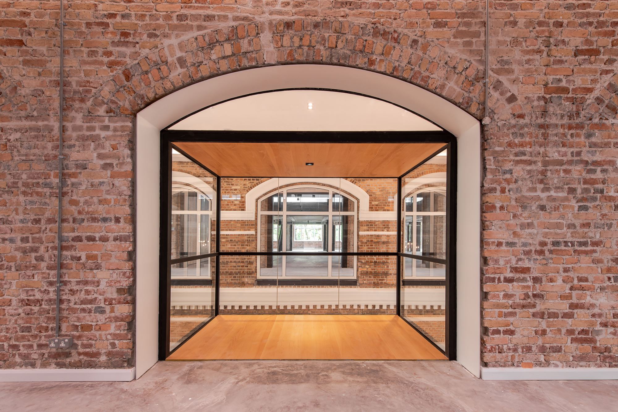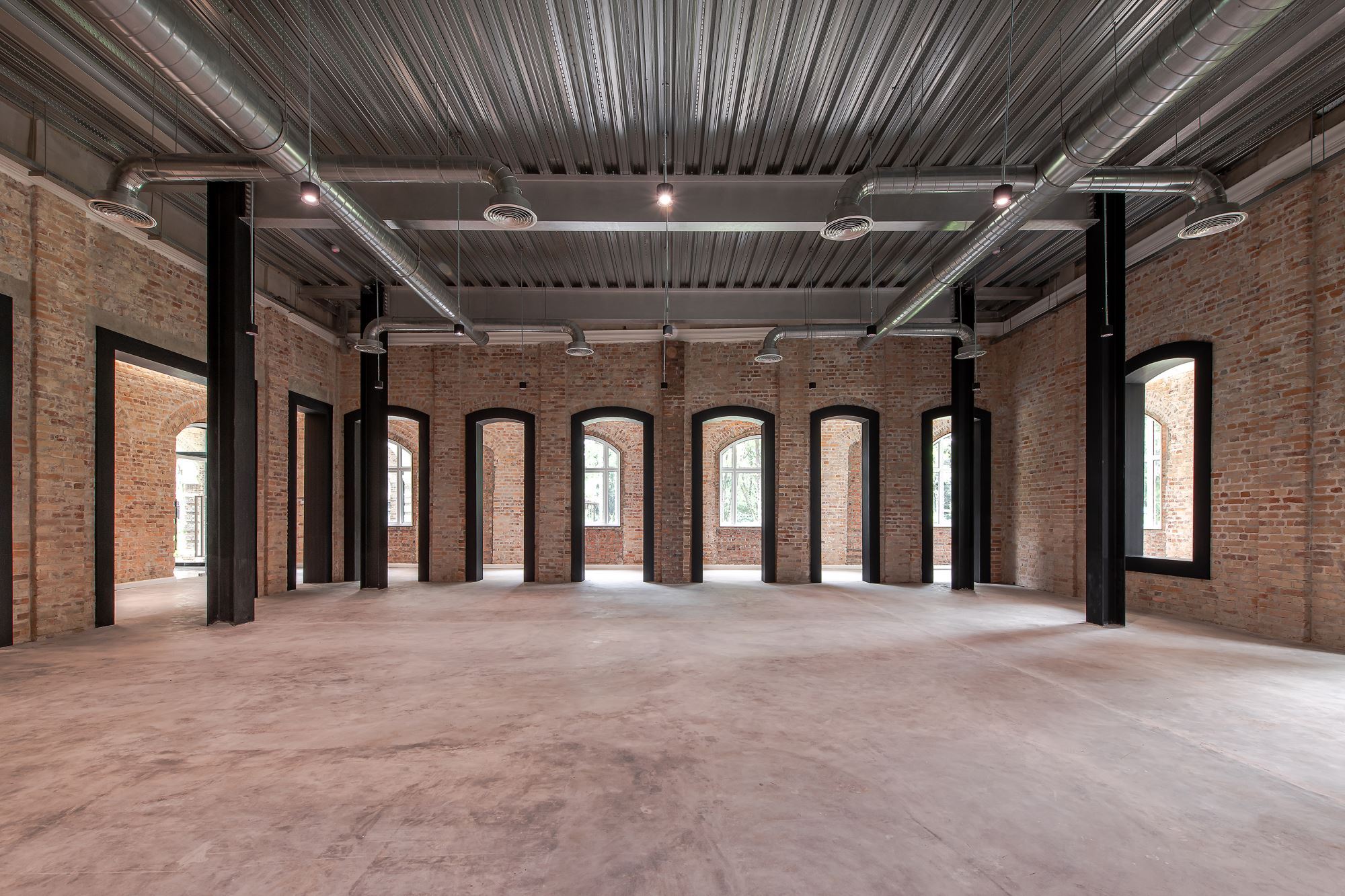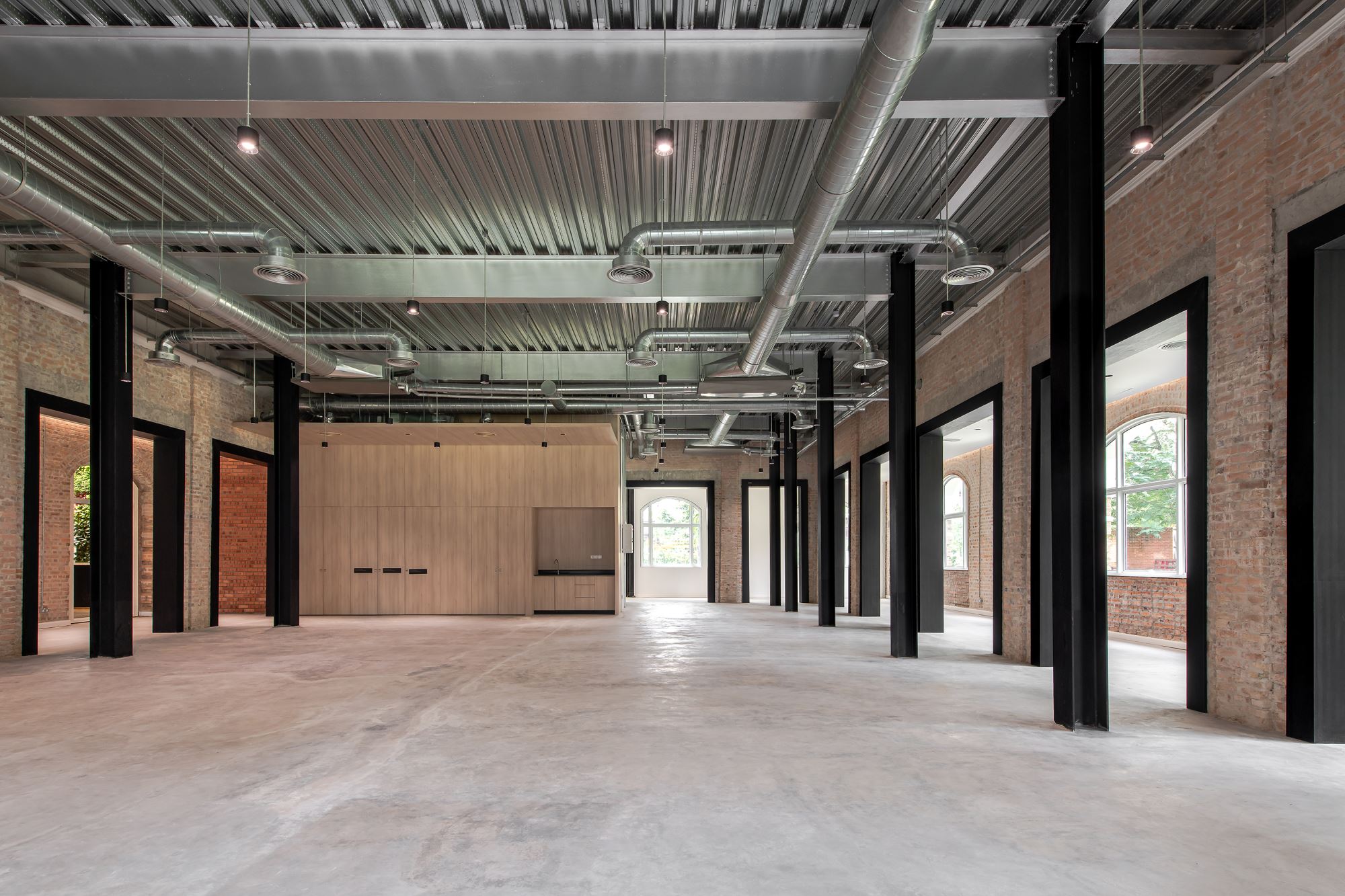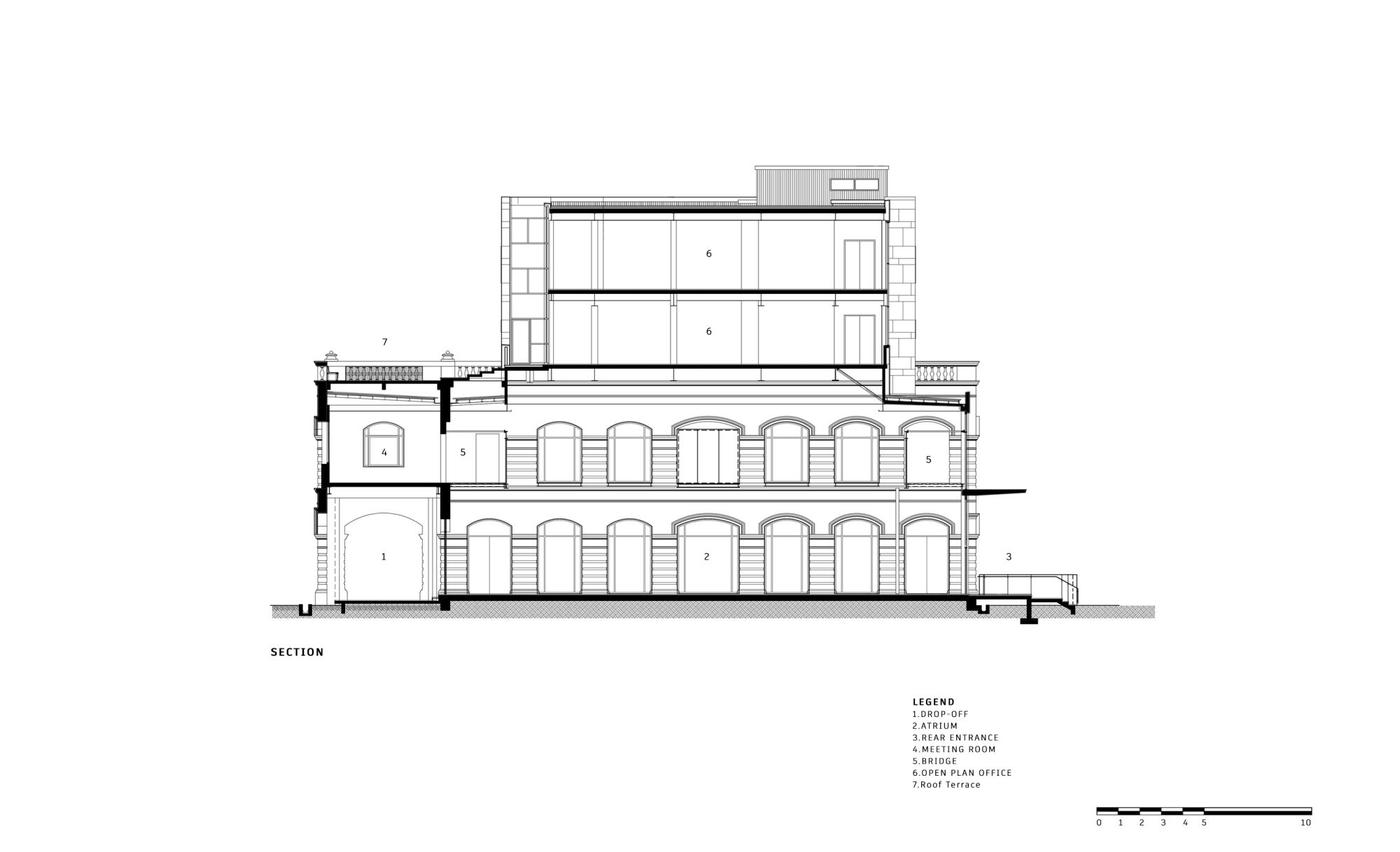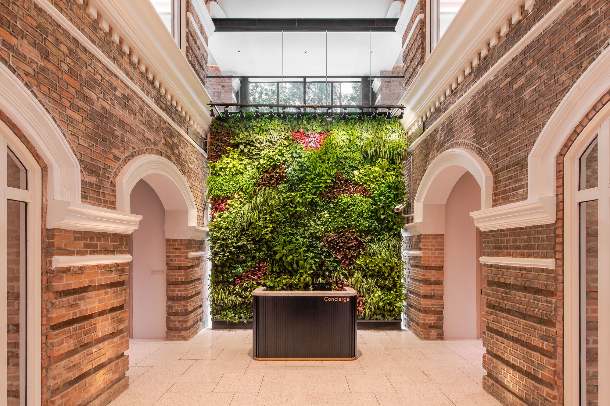 The overall gridline is generated by superimposing 3 grids include the original façade brick arched colonnades grid, an enlarged colonial brick laying pattern grid, and a new internal steel column grid.