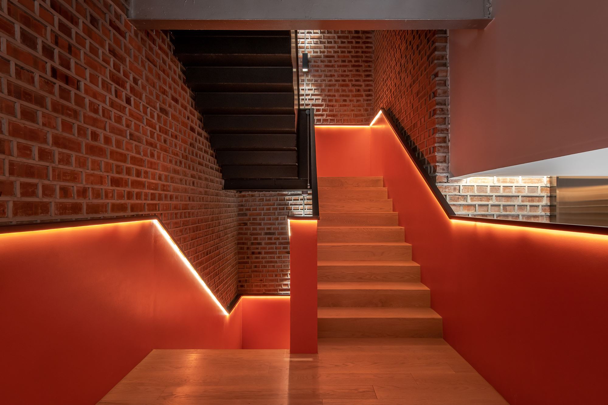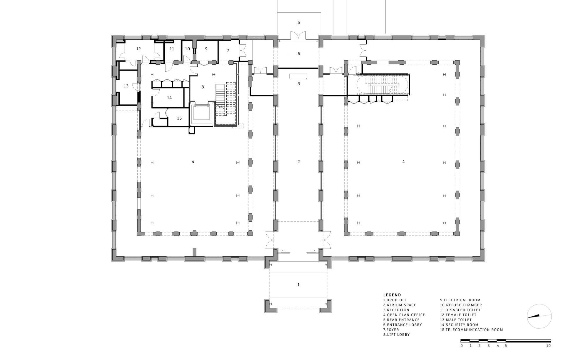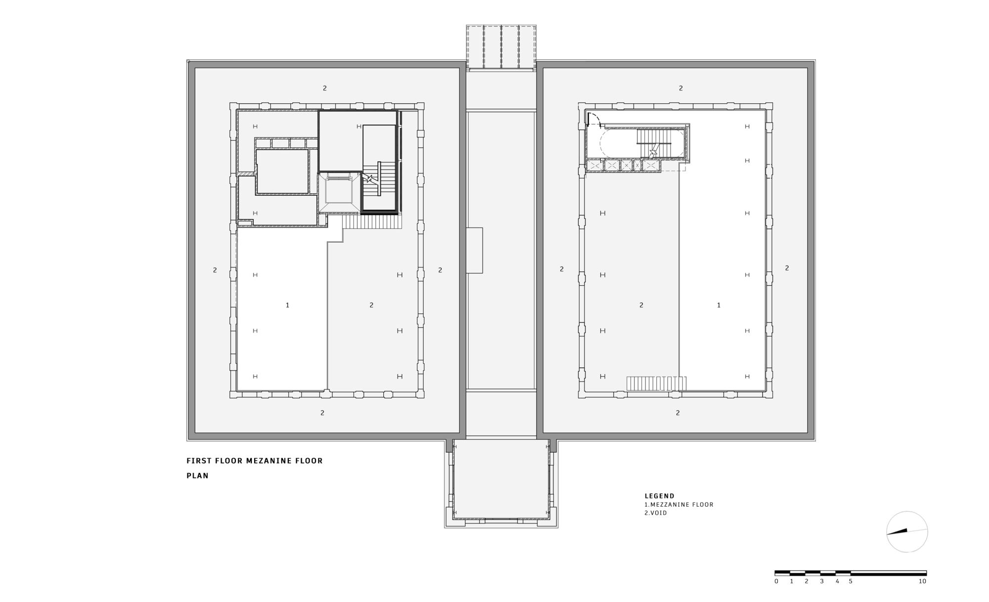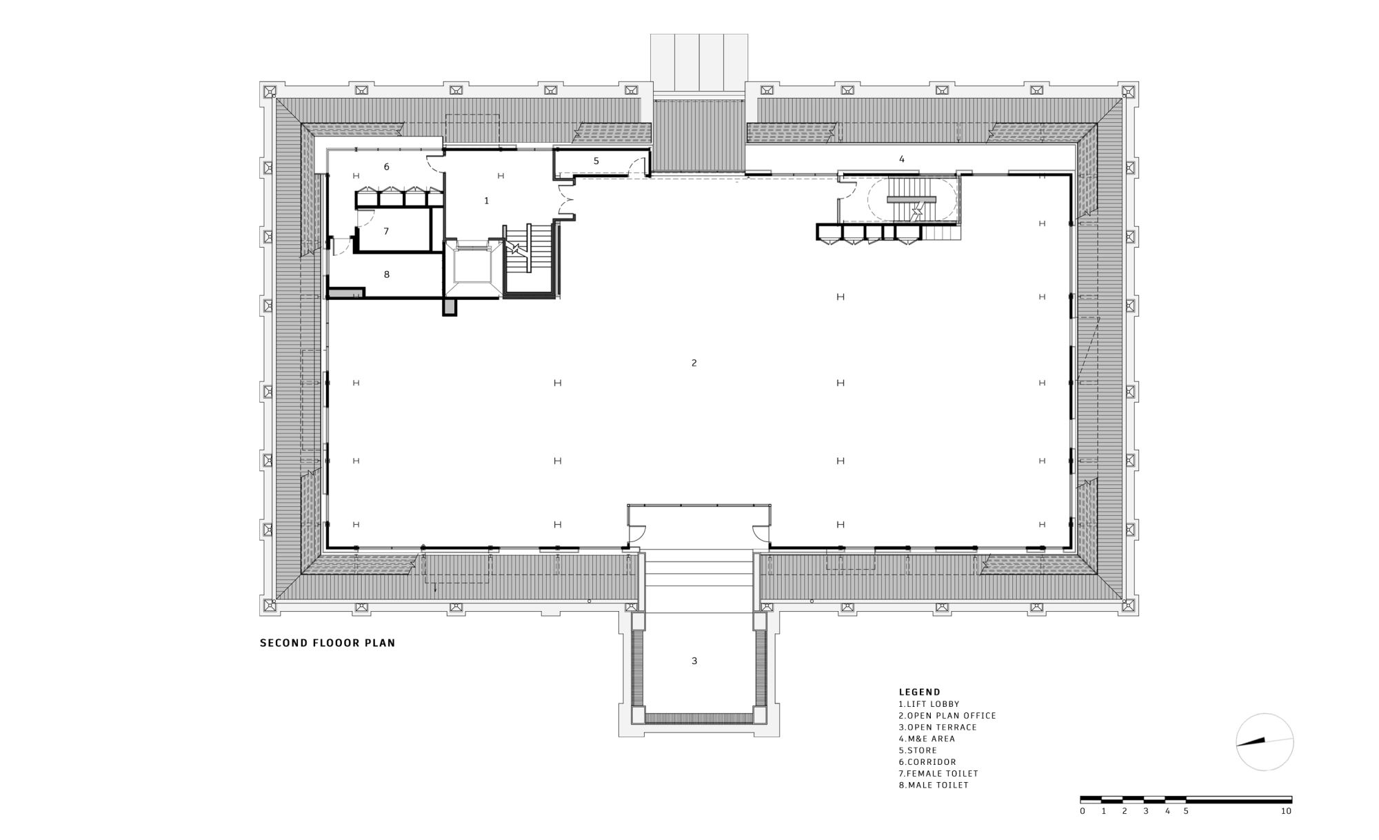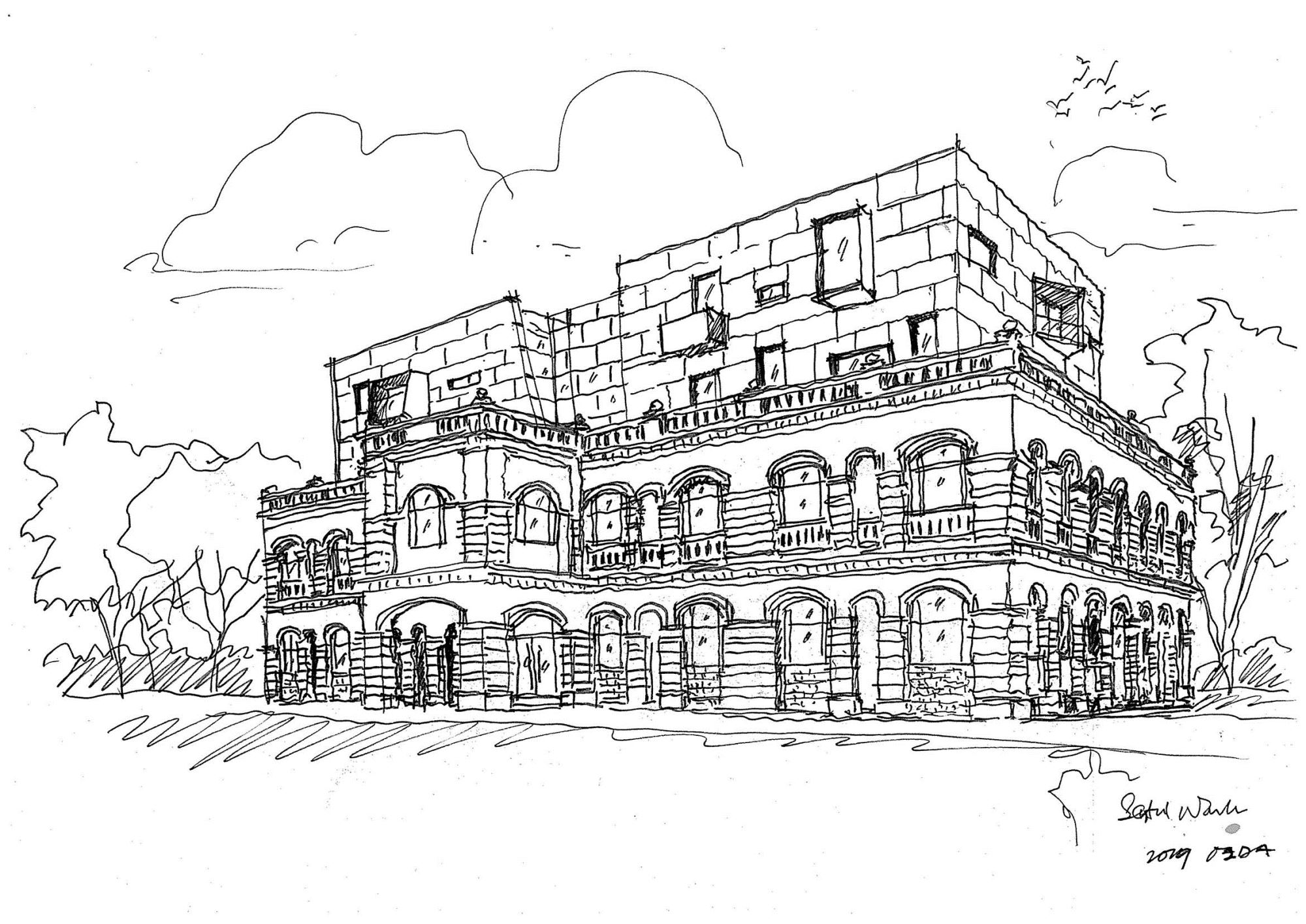 The overall gridline is generated by superimposing 3 grids include the original façade brick arched colonnades grid, an enlarged colonial brick laying pattern grid, and a new internal steel column grid.