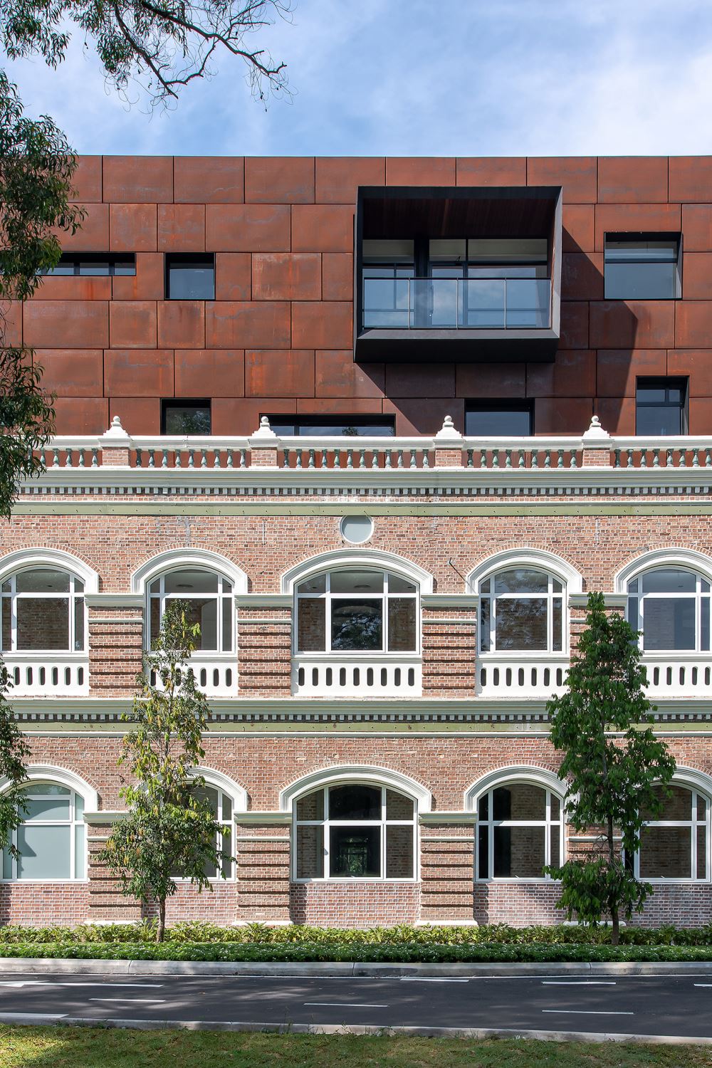A central glass curtain wall breaks the homogeneity of the Corten-clad new mass. The façade break enhances the quality of modern abstraction and conformity to the domineering and symmetrical colonial architecture below.