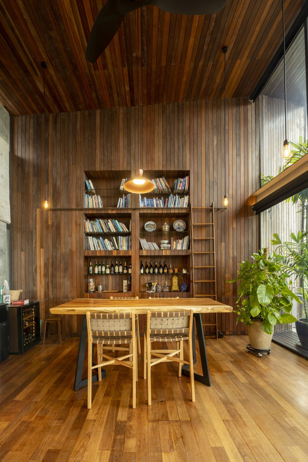 Raw concrete, polished terrazzo, and Yellow Balau timber—a hardwood native to Malaysia—anchor the home’s aesthetic. The timber envelops interiors in warmth, its grain echoing the surrounding green reserve, while exposed concrete grounds the space in simplicity. These choices refect a broader architectural shift in Malaysia, where vernacular materials are reinterpreted through modern techniques. The tactile richness of wood and stone speaks to a collective memory of craftsmanship, even as their application remains resolutely contemporary.