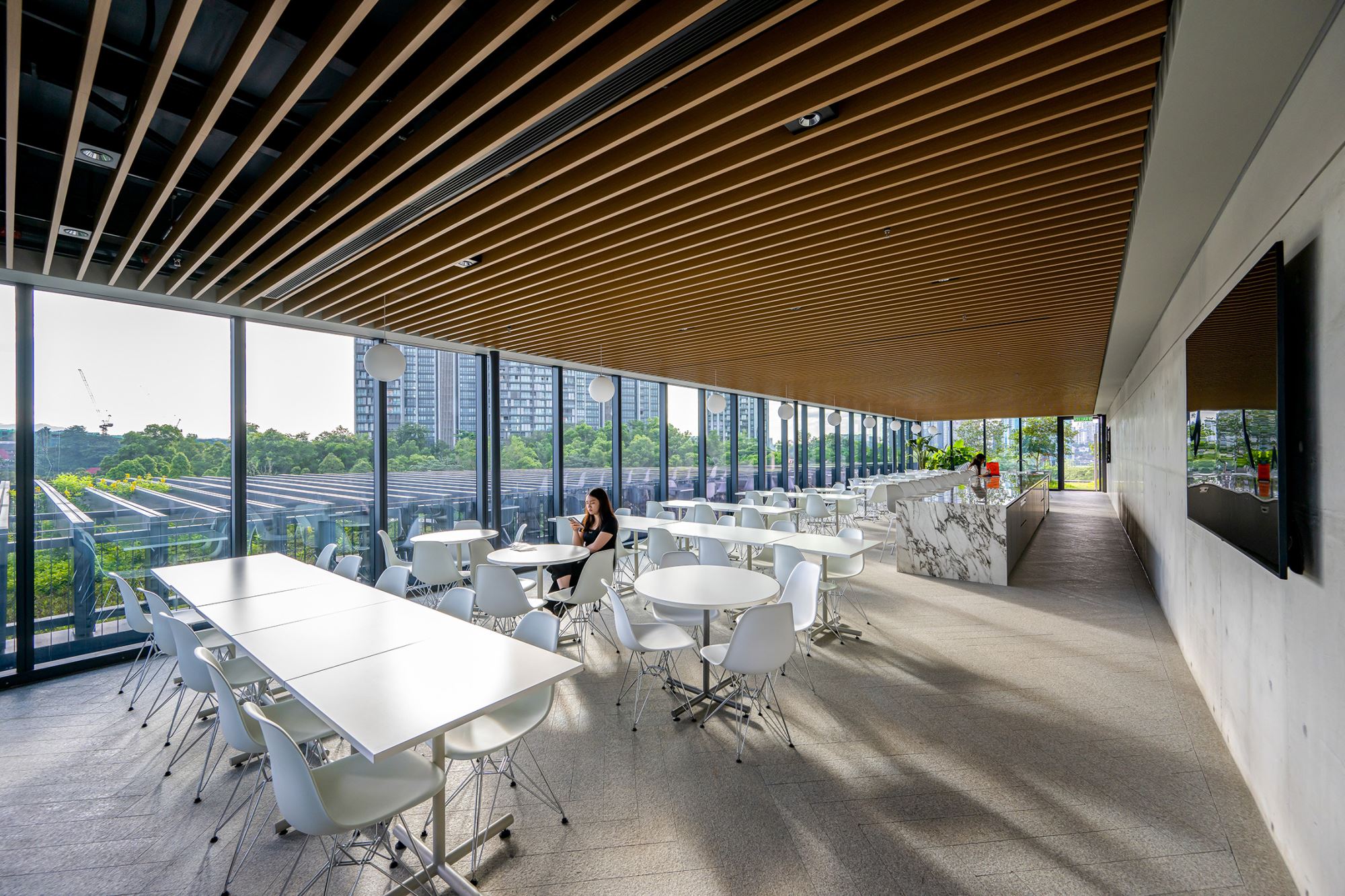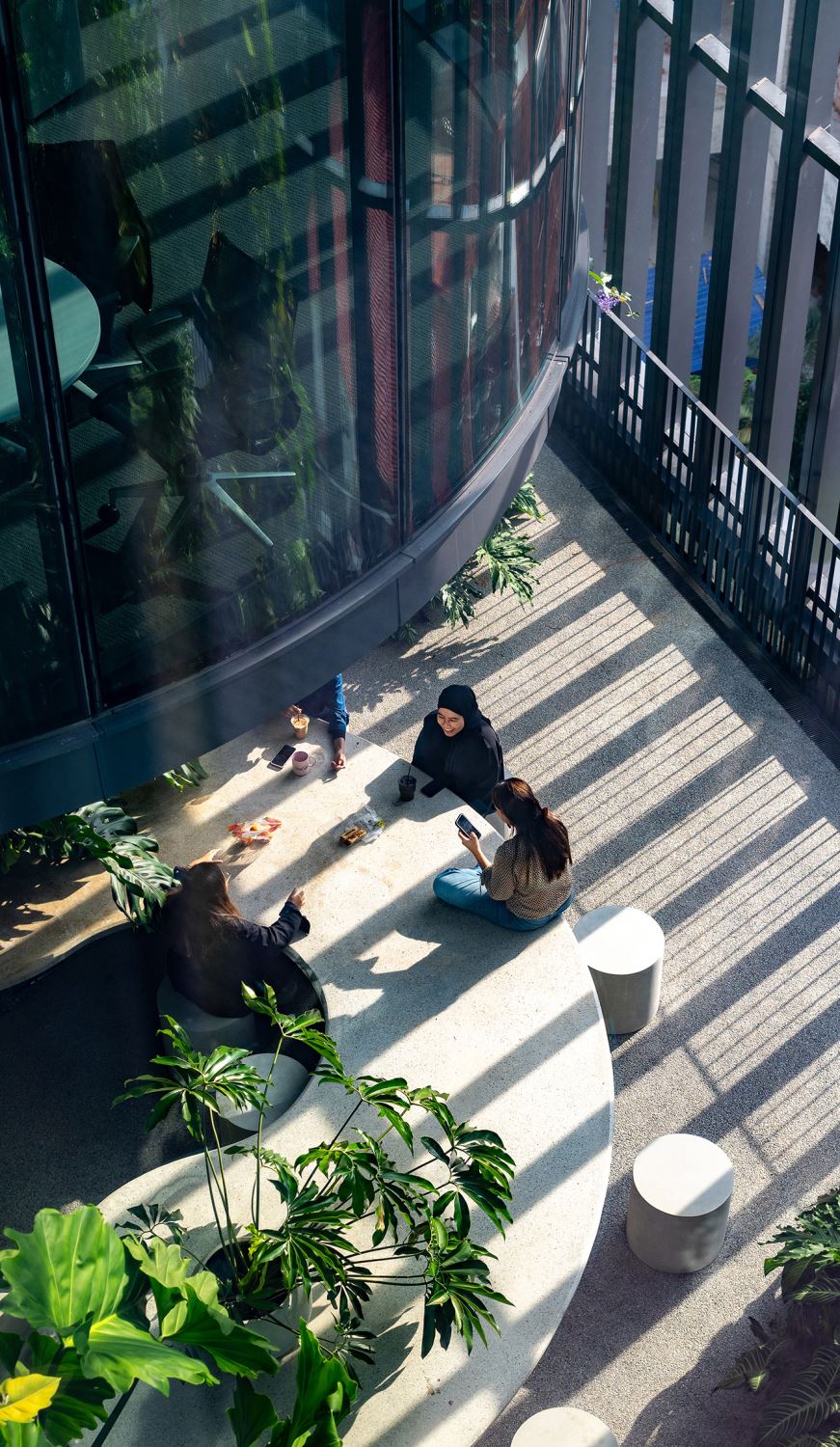 GDP's community engagement extends beyond its own practice through a public gallery space on the fourth foor, which hosts curated design exhibitions focusing on Malaysian artists and designers. The top garden space has been thoughtfully reimagined as a vibrant staf canteen where nature meets nourishment. More than just a dining area, this space serves as a communal hub that promotes well-being, collaboration, and a sense of belonging among team members.