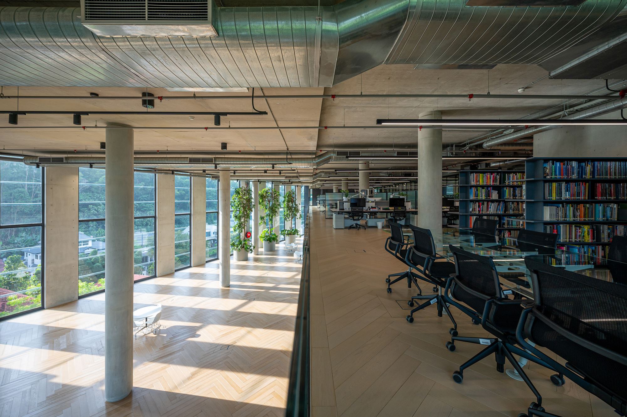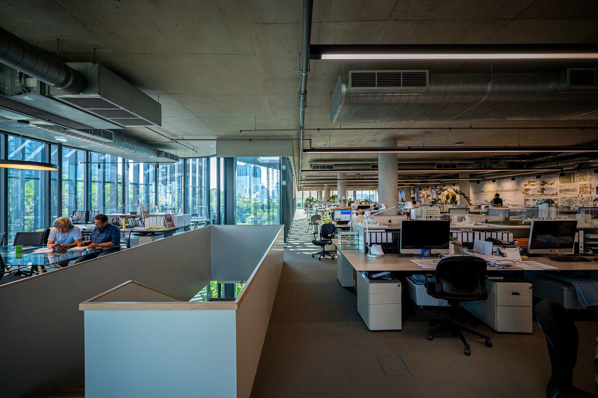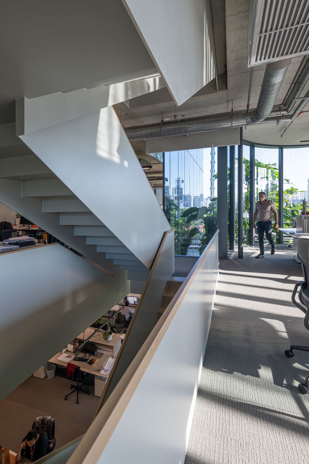 The 8-storey structure transcends conventional ofce typology through strategic spatial interventions. Double-height voids, mezzanine insertions, and cascading terraced gardens transform standard foor plates. Expansive curtain walling foods the workspace with natural light. This spatial composition manifests GDP's collaborative ethos, deliberately eschewing traditional corner ofces and hierarchical arrangements in favor of fuid, open-plan studios that facilitate cross-disciplinary exchange. The design choreographs circulation to encourage spontaneous encounters while providing varied settings that support diferent modes of thought and interaction.