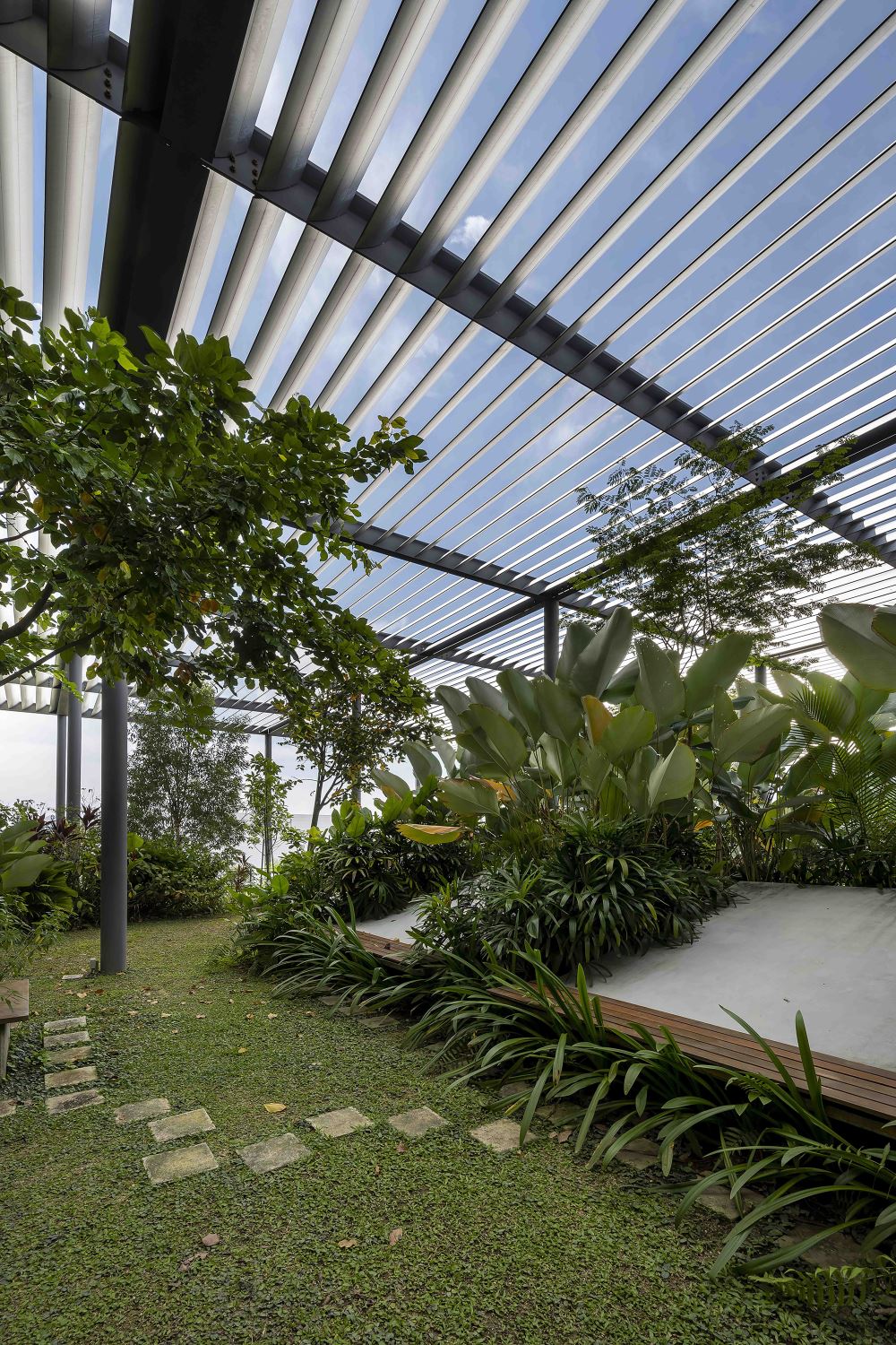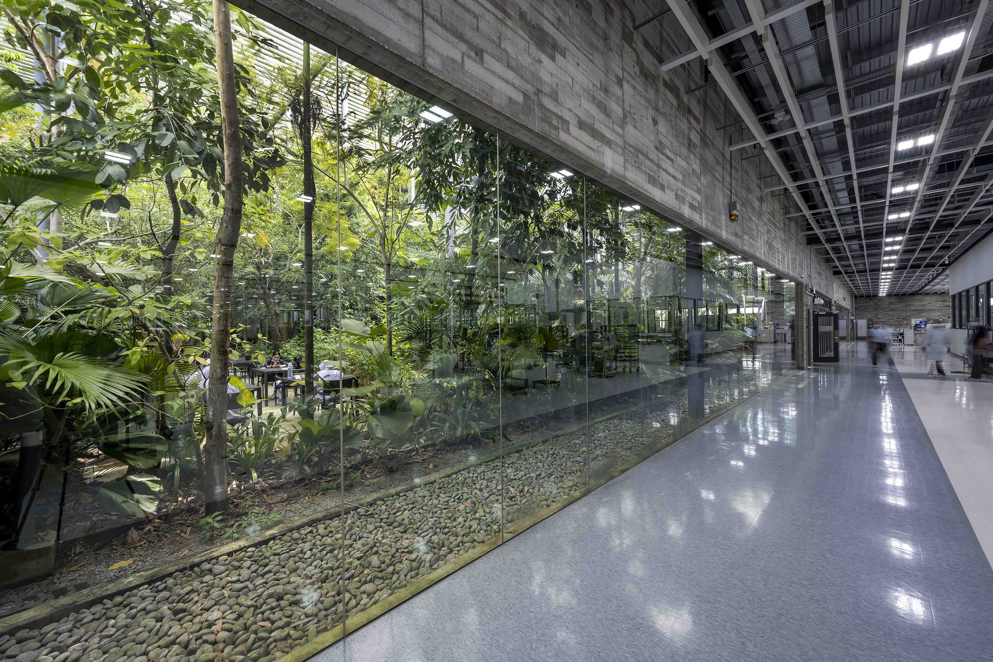 The factory has views to landscape and the sky condition through full height and clerestory glazing with the glazing protected from the sun by free-standing of-form concrete fns and roof louvers. Rainwater cascades from roof spouts – heightening awareness of tropical storms – to storage tanks for landscape irrigation. The plant receives natural difused light across the entire factory foor reducing dependency on artifcial lighting that, combined with chilled water foor slab cooling & cutting-edge air-conditioning technology, reduces energy consumption to half that of a conventional plant of similar size.