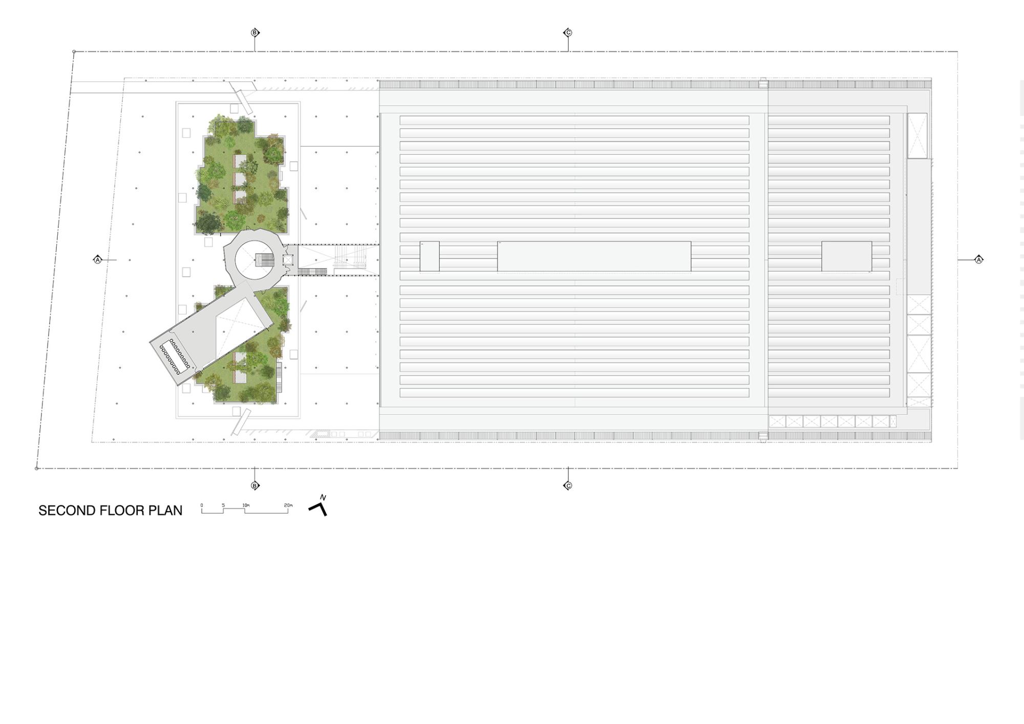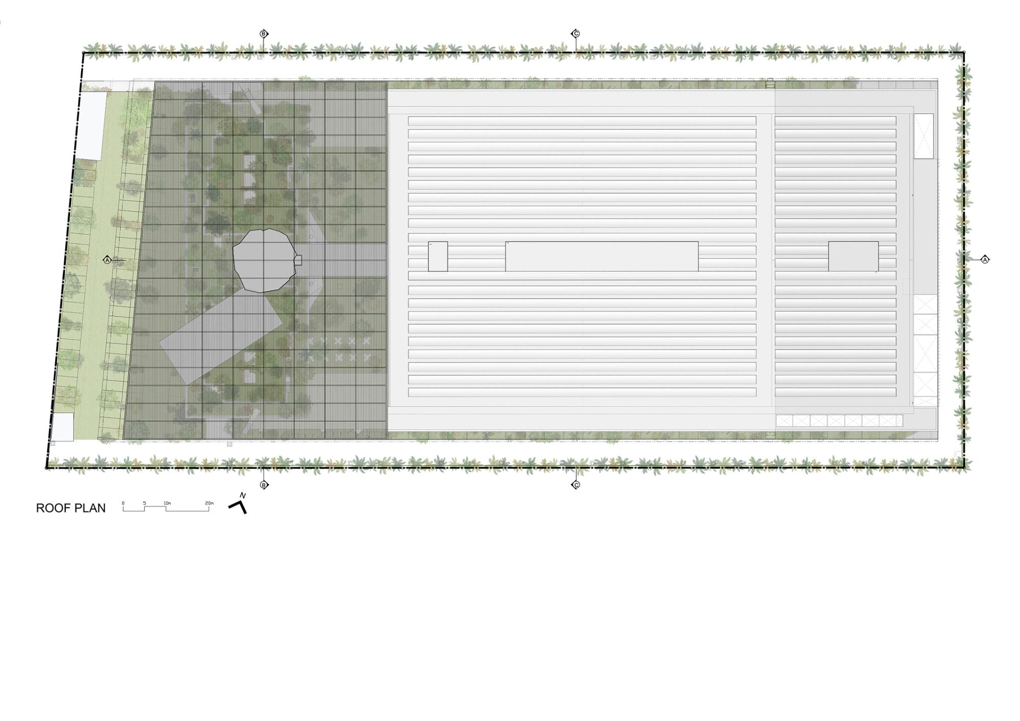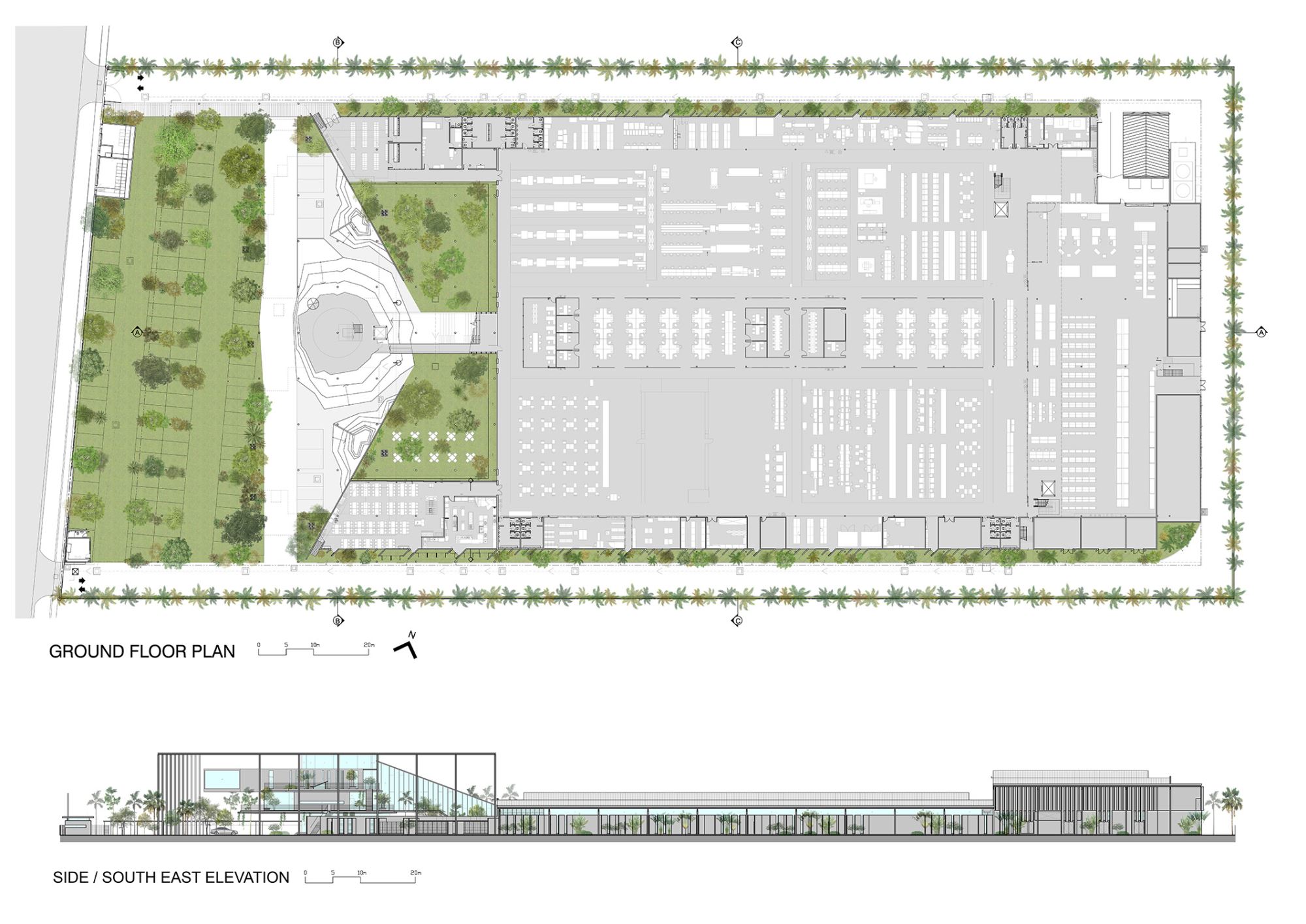 As an architectural competition winning entry for an electronics manufacturing plant, this site is conceived as a forest that penetrates, surrounds & steps over the building creating maximum contact with nature – green, breeze, scent, sound, touch.