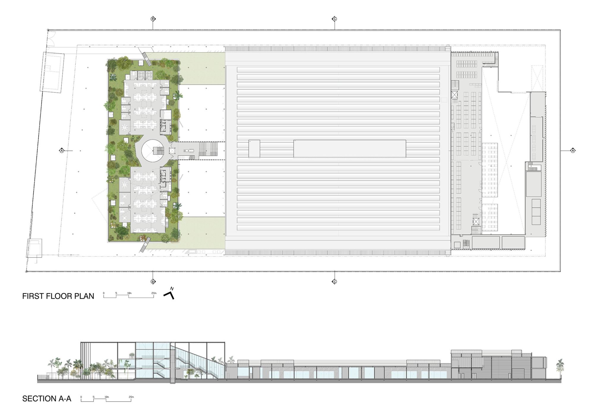 A canopy supported by a ‘forest’ of columns creates unity to ofce & courtyard while giving protection from the tropical sun. Ofce levels give access to roof gardens and staf are encouraged out for breaks, meetings or just contemplation. A green courtyard separates the ofce & factory with views and access from both. A bridge over the courtyard links the ofce & production, and this circulation route becomes a space for meetings, breaks & lectures.
