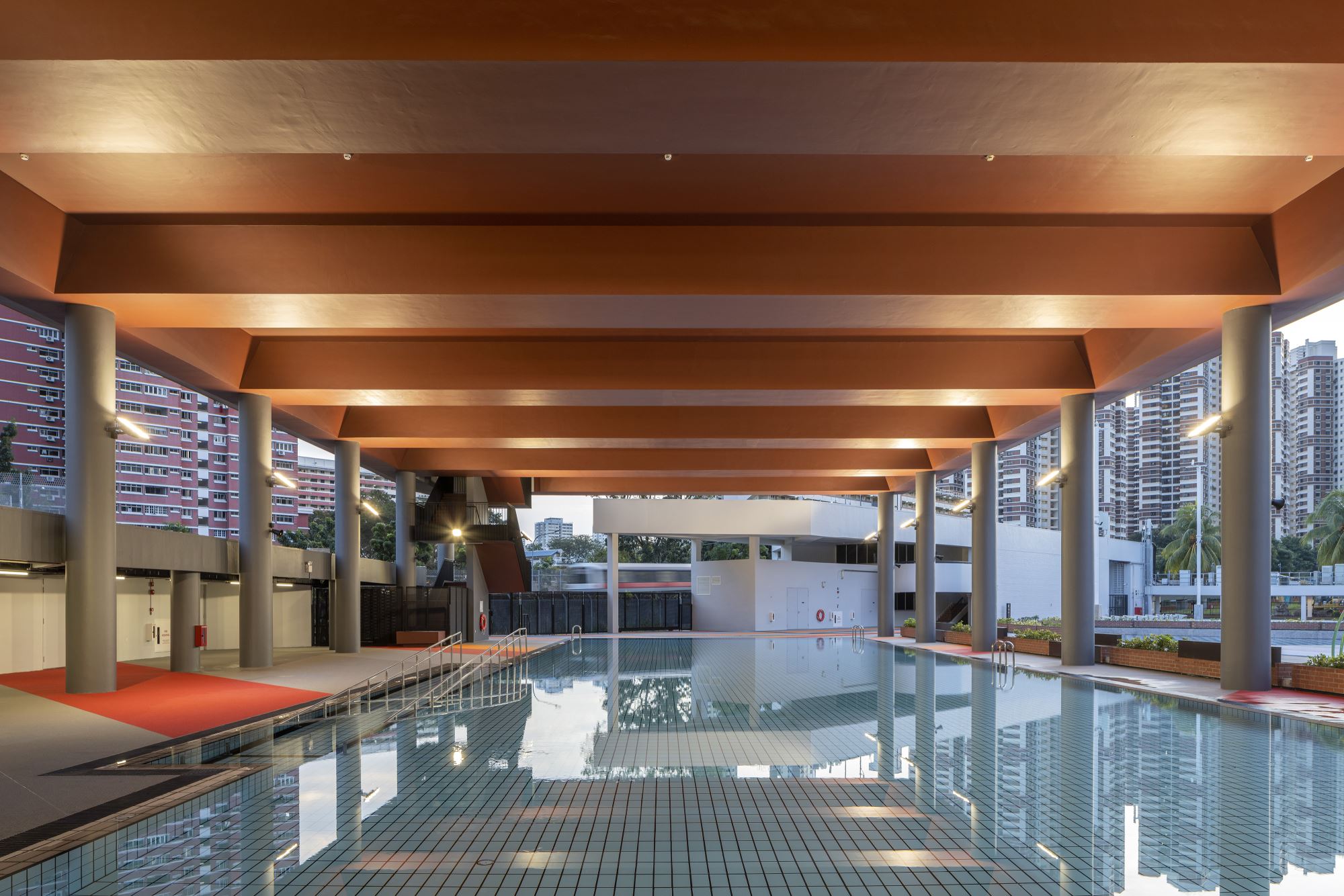 The complex brings people of different physical abilities together through sport. It does so through its facilities as well as connectivity across the complex. Of note is the accessible teaching pool, which incorporates a gentle ramp to enter and exit the pool. The complex also prioritises pedestrian connectivity to the surroundings and its various facilities. It does so through the use of a seamless thoroughfare on the second storey that cleverly integrates levels of the overhead bridge across Tiong Bahru Road and structural levels of the existing complex. The strategic elevator placement near the thoroughfare facilitates vertical access across levels.