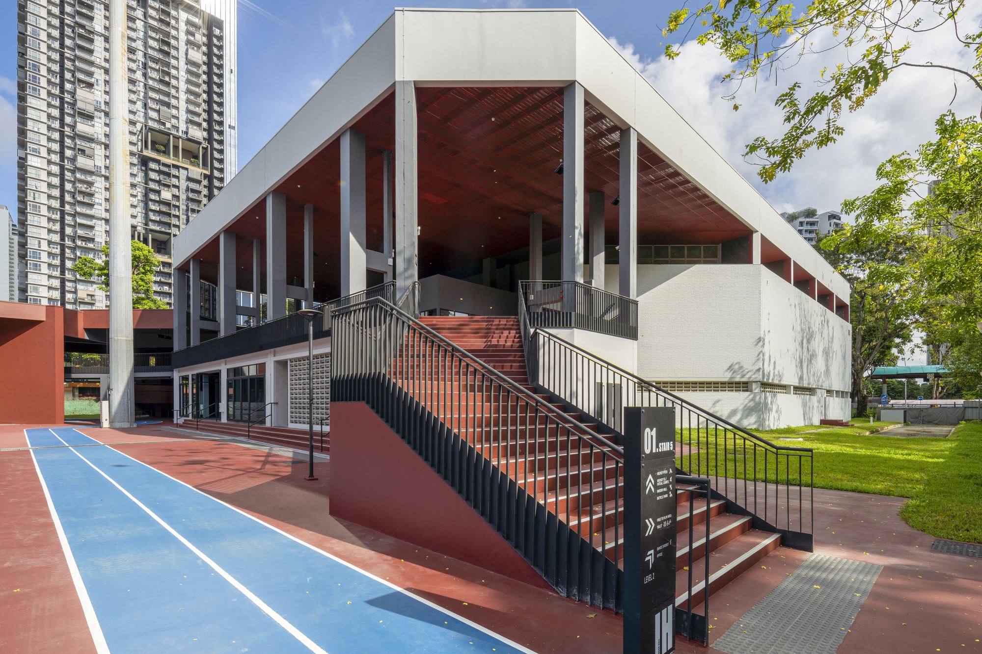 The intervention frst links up the venues previously operating separately as an integrated complex using "one active bridge". This is an elevated thoroughfare that extends the overhead bridge crossing Tiong Bahru Road into the complex. Along this promenade, the pedestrian is frst welcomed into the spatial volume with the sheltered teaching pool, then passes through and overlooks the hockey and futsal felds in the middle of the site, before reaching the indoor sports hall at the northern boundary.
